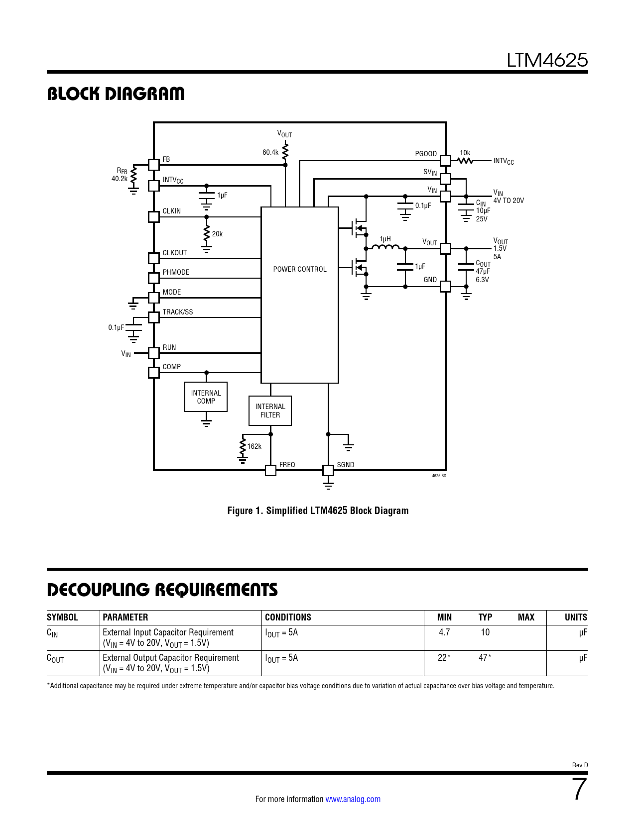 BLOCK DIAGRAM. Figure 1. Simplified LTM4625 Block Diagram. DECOUPLING REQUIREMENTS SYMBOL. PARAMETER. CONDITIONS. MIN. TYP. MAX. UNITS
