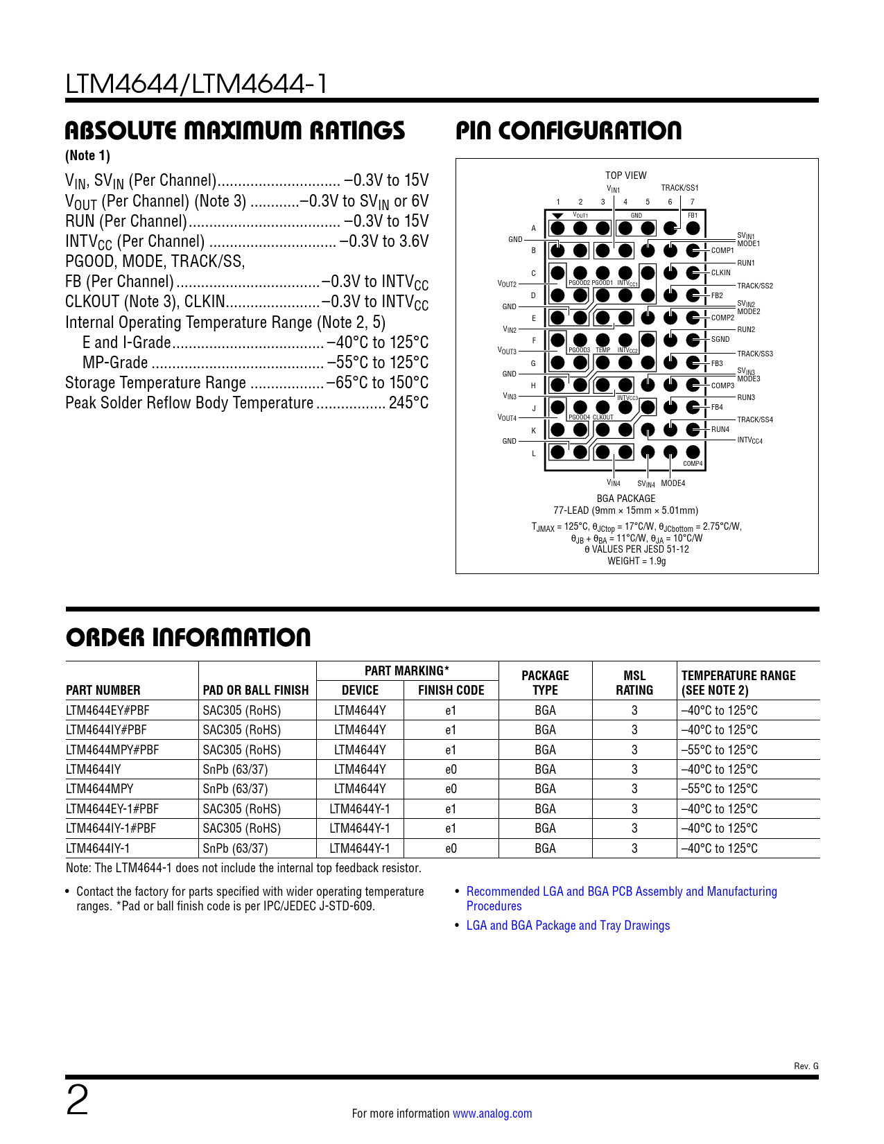 LTM4644/LTM4644-1 ABSOLUTE MAXIMUM RATINGSPIN CONFIGURATION(Note 1) V TOP VIEW IN, SVIN (Per Channel) .. –0.3V to 15V VIN1 TRACK/SS1 VOUT (Per Channel) (Note 3) ..–0.3V to SVIN or 6V 1 2 3 4 5 6 7 RUN (Per Channel) ... –0.3V to 15V VOUT1 GND FB1 A INTV SV CC (Per Channel) ... –0.3V to 3.6V IN1 GND MODE1 PGOOD, MODE, TRACK/SS, B COMP1 RUN1 FB (Per Channel) ...–0.3V to INTV C CLKIN CC V PGOOD2 PGOOD1 INTV OUT2 CC1 TRACK/SS2 CLKOUT (Note 3), CLKIN ...–0.3V to INTV D FB2 CC SV GND IN2 Internal Operating Temperature Range (Note 2, 5) MODE2 E COMP2 VIN2 RUN2 E and I-Grade ... –40°C to 125°C F SGND V PGOOD3 TEMP INTV MP-Grade .. –55°C to 125°C OUT3 CC2 TRACK/SS3 G FB3 SV Storage Temperature Range .. –65°C to 150°C IN3 GND MODE3 H COMP3 Peak Solder Reflow Body Temperature ... 245°C VIN3 INTVCC3 RUN3 J FB4 VOUT4 PGOOD4 CLKOUT TRACK/SS4 K RUN4 GND INTVCC4 L COMP4 VIN4 SVIN4 MODE4 BGA PACKAGE 77-LEAD (9mm × 15mm × 5.01mm) TJMAX = 125°C, θJCtop = 17°C/W, θJCbottom = 2.75°C/W, θJB + θBA = 11°C/W, θJA = 10°C/W θ VALUES PER JESD 51-12 WEIGHT = 1.9g ORDER INFORMATIONPART MARKING*PACKAGEMSLTEMPERATURE RANGEPART NUMBERPAD OR BALL FINISHDEVICEFINISH CODETYPERATING(SEE NOTE 2) LTM4644EY#PBF SAC305 (RoHS) LTM4644Y e1 BGA 3 –40°C to 125°C LTM4644IY#PBF SAC305 (RoHS) LTM4644Y e1 BGA 3 –40°C to 125°C LTM4644MPY#PBF SAC305 (RoHS) LTM4644Y e1 BGA 3 –55°C to 125°C LTM4644IY SnPb (63/37) LTM4644Y e0 BGA 3 –40°C to 125°C LTM4644MPY SnPb (63/37) LTM4644Y e0 BGA 3 –55°C to 125°C LTM4644EY-1#PBF SAC305 (RoHS) LTM4644Y-1 e1 BGA 3 –40°C to 125°C LTM4644IY-1#PBF SAC305 (RoHS) LTM4644Y-1 e1 BGA 3 –40°C to 125°C LTM4644IY-1 SnPb (63/37) LTM4644Y-1 e0 BGA 3 –40°C to 125°C Note: The LTM4644-1 does not include the internal top feedback resistor. • Contact the factory for parts specified with wider operating temperature • Recommended LGA and BGA PCB Assembly and Manufacturing ranges. *Pad or ball finish code is per IPC/JEDEC J-STD-609. Procedures • LGA and BGA Package and Tray Drawings Rev. G 2 For more information www.analog.com Document Outline Features Applications Typical Application Description Absolute Maximum Ratings Order Information Pin Configuration Electrical Characteristics Typical Performance Characteristics Block Diagram Decoupling Requirements Operation Applications Information Typical Applications Package Description Revision History Package Photo Design Resources Related Parts