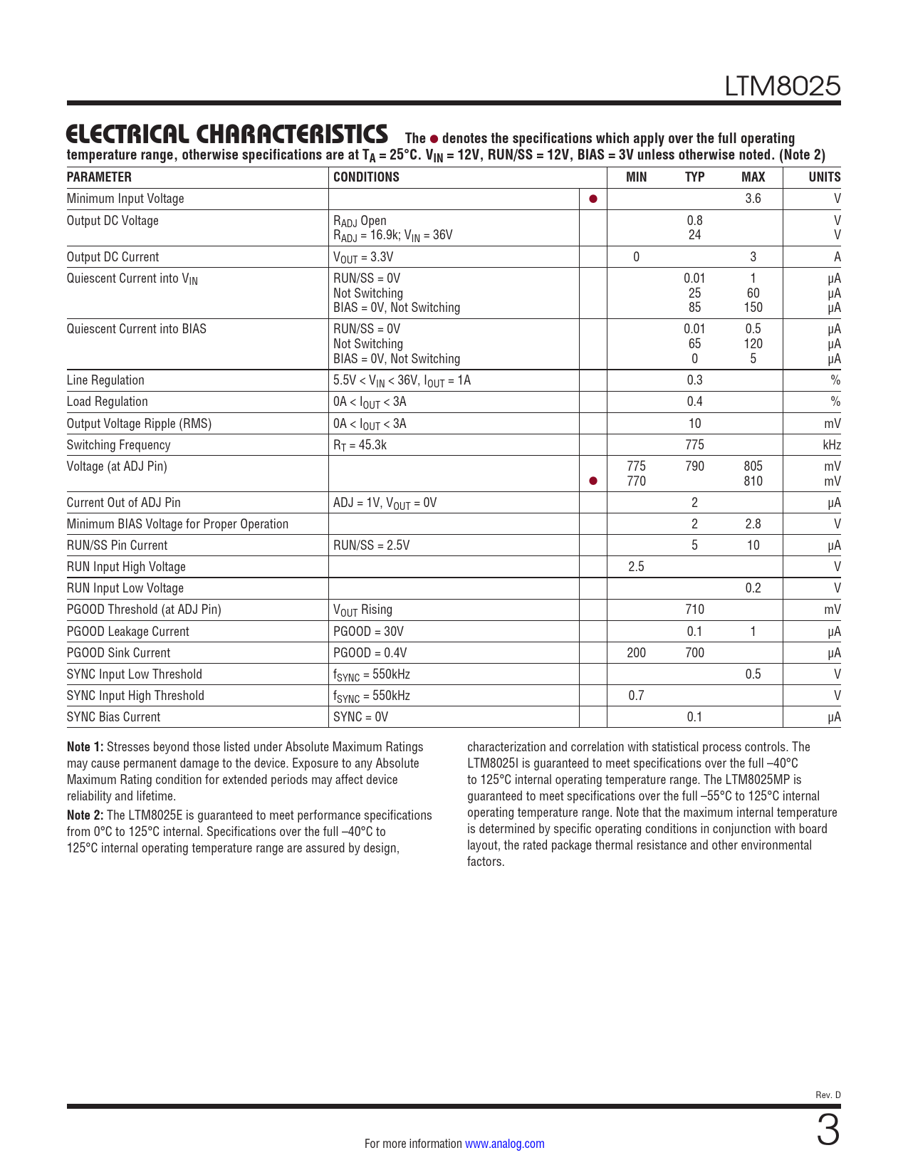 LTM8025 ELECTRICAL CHARACTERISTICSThe l denotes the specifications which apply over the full operatingtemperature range, otherwise specifications are at TA = 25°C. VIN = 12V, RUN/SS = 12V, BIAS = 3V unless otherwise noted. (Note 2) PARAMETERCONDITIONSMINTYPMAXUNITS Minimum Input Voltage l 3.6 V Output DC Voltage RADJ Open 0.8 V RADJ = 16.9k; VIN = 36V 24 V Output DC Current VOUT = 3.3V 0 3 A Quiescent Current into VIN RUN/SS = 0V 0.01 1 µA Not Switching 25 60 µA BIAS = 0V, Not Switching 85 150 µA Quiescent Current into BIAS RUN/SS = 0V 0.01 0.5 µA Not Switching 65 120 µA BIAS = 0V, Not Switching 0 5 µA Line Regulation 5.5V < VIN < 36V, IOUT = 1A 0.3 % Load Regulation 0A < IOUT < 3A 0.4 % Output Voltage Ripple (RMS) 0A < IOUT < 3A 10 mV Switching Frequency RT = 45.3k 775 kHz Voltage (at ADJ Pin) 775 790 805 mV l 770 810 mV Current Out of ADJ Pin ADJ = 1V, VOUT = 0V 2 µA Minimum BIAS Voltage for Proper Operation 2 2.8 V RUN/SS Pin Current RUN/SS = 2.5V 5 10 µA RUN Input High Voltage 2.5 V RUN Input Low Voltage 0.2 V PGOOD Threshold (at ADJ Pin) VOUT Rising 710 mV PGOOD Leakage Current PGOOD = 30V 0.1 1 µA PGOOD Sink Current PGOOD = 0.4V 200 700 µA SYNC Input Low Threshold fSYNC = 550kHz 0.5 V SYNC Input High Threshold fSYNC = 550kHz 0.7 V SYNC Bias Current SYNC = 0V 0.1 µA Note 1: Stresses beyond those listed under Absolute Maximum Ratings characterization and correlation with statistical process controls. The may cause permanent damage to the device. Exposure to any Absolute LTM8025I is guaranteed to meet specifications over the full –40°C Maximum Rating condition for extended periods may affect device to 125°C internal operating temperature range. The LTM8025MP is reliability and lifetime. guaranteed to meet specifications over the full –55°C to 125°C internal Note 2: The LTM8025E is guaranteed to meet performance specifications operating temperature range. Note that the maximum internal temperature from 0°C to 125°C internal. Specifications over the full –40°C to is determined by specific operating conditions in conjunction with board 125°C internal operating temperature range are assured by design, layout, the rated package thermal resistance and other environmental factors. Rev. D For more information www.analog.com 3 Document Outline Features Applications Typical Application Description Absolute Maximum Ratings Pin Configuration Order Information Electrical Characteristics Typical Performance Characteristics Pin Functions Block Diagram Operation Applications Information Package Description Revision History Package Photography Typical Application Related Parts