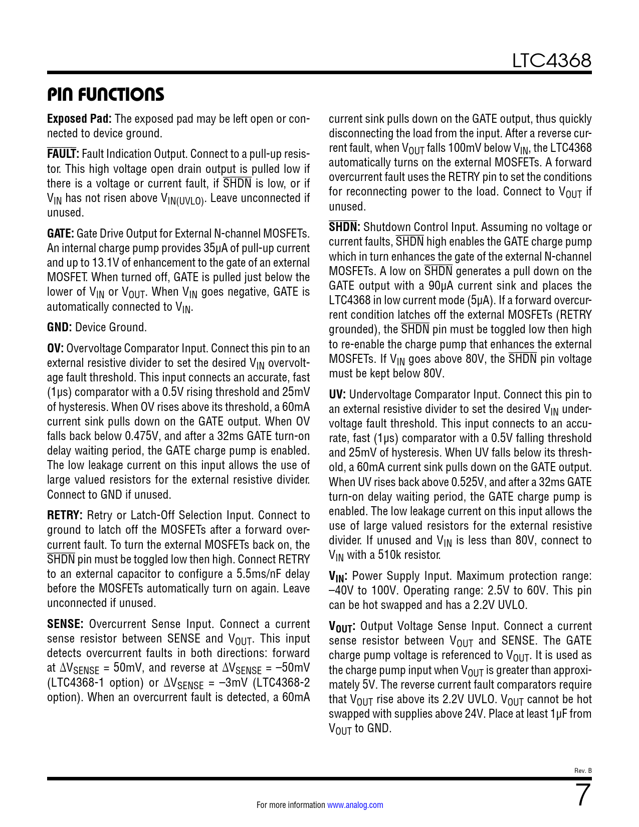 页数 / 页22 / 7 — PIN FUNCTIONS Exposed Pad:. FAULT:. GATE:. SHDN:. GND:. OV:. UV:. RETRY:. …