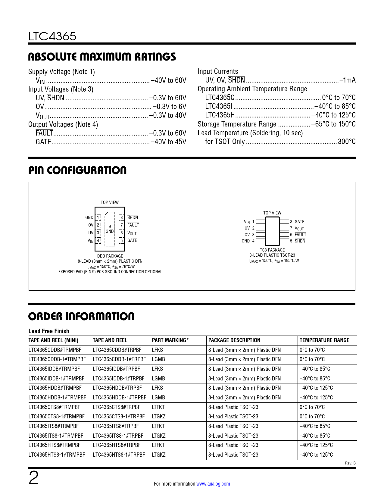 LTC4365CDDB#TRMPBF LTC4365CDDB#TRPBF LFKS 8-Lead (3mm × 2mm) Plastic DFN 0°C to 70°C LTC4365CDDB-1#TRMPBF LTC4365CDDB-1#TRPBF LGMB 8-Lead (3mm × 2mm) Plastic DFN 0°C to 70°C LTC4365IDDB#TRMPBF LTC4365IDDB#TRPBF LFKS 8-Lead (3mm × 2mm) Plastic DFN –40°C to 85°C LTC4365IDDB-1#TRMPBF LTC4365IDDB-1#TRPBF LGMB 8-Lead (3mm × 2mm) Plastic DFN –40°C to 85°C LTC4365HDDB#TRMPBF LTC4365HDDB#TRPBF LFKS 8-Lead (3mm × 2mm) Plastic DFN –40°C to 125°C LTC4365HDDB-1#TRMPBF LTC4365HDDB-1#TRPBF LGMB 8-Lead (3mm × 2mm) Plastic DFN –40°C to 125°C LTC4365CTS8#TRMPBF LTC4365CTS8#TRPBF LTFKT 8-Lead Plastic TSOT-23 0°C to 70°C LTC4365CTS8-1#TRMPBF LTC4365CTS8-1#TRPBF LTGKZ 8-Lead Plastic TSOT-23 0°C to 70°C LTC4365ITS8#TRMPBF LTC4365ITS8#TRPBF LTFKT 8-Lead Plastic TSOT-23 –40°C to 85°C LTC4365ITS8-1#TRMPBF LTC4365ITS8-1#TRPBF LTGKZ 8-Lead Plastic TSOT-23 –40°C to 85°C LTC4365HTS8#TRMPBF LTC4365HTS8#TRPBF LTFKT 8-Lead Plastic TSOT-23 –40°C to 125°C LTC4365HTS8-1#TRMPBF LTC4365HTS8-1#TRPBF LTGKZ 8-Lead Plastic TSOT-23 –40°C to 125°C Rev. B 2 For more information www.analog.com Document Outline Features Applications Typical Application Description Absolute Maximum Ratings Pin Configuration Order Information Electrical Characteristics Typical Performance Characteristics Pin Functions Block Diagram Operation Applications Information Package Description Revision History Typical Application Related Parts