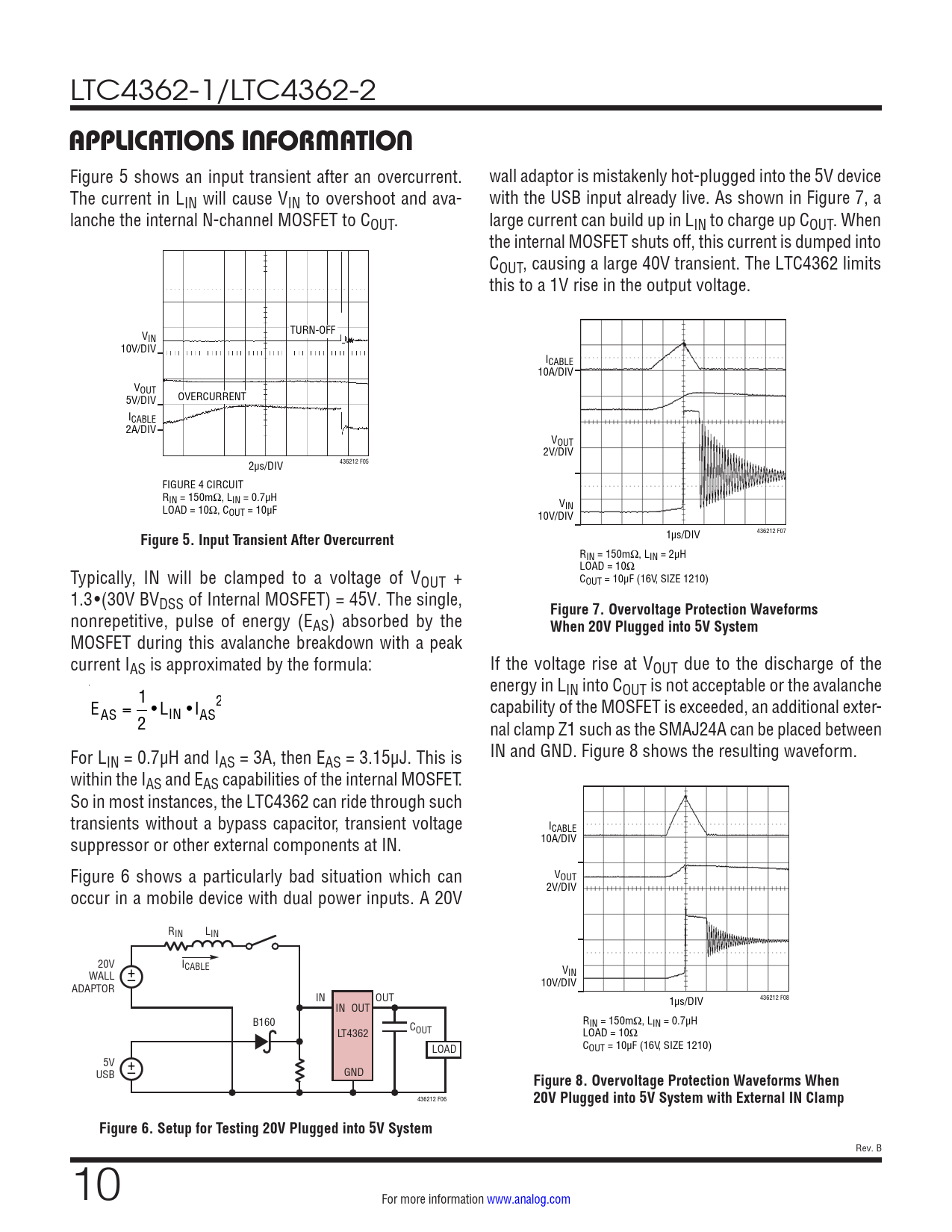 link to page 10 link to page 10 link to page 10 link to page 10 LTC4362-1/LTC4362-2 APPLICATIONS INFORMATION Figure 5 shows an input transient after an overcurrent. wall adaptor is mistakenly hot-plugged into the 5V device The current in LIN will cause VIN to overshoot and ava- with the USB input already live. As shown in Figure 7, a lanche the internal N-channel MOSFET to COUT. large current can build up in LIN to charge up COUT. When the internal MOSFET shuts off, this current is dumped into COUT, causing a large 40V transient. The LTC4362 limits this to a 1V rise in the output voltage. V TURN-OFF IN 10V/DIV ICABLE 10A/DIV VOUT 5V/DIV OVERCURRENT ICABLE 2A/DIV VOUT 2V/DIV 2µs/DIV 436212 F05 FIGURE 4 CIRCUIT RIN = 150mΩ, LIN = 0.7µH LOAD = 10Ω, C VIN OUT = 10µF 10V/DIV Figure 5. Input Transient After Overcurrent 1µs/DIV 436212 F07 RIN = 150mΩ, LIN = 2µH LOAD = 10Ω Typical y, IN wil be clamped to a voltage of V COUT = 10µF (16V, SIZE 1210) OUT + 1.3•(30V BVDSS of Internal MOSFET) = 45V. The single, Figure 7. Overvoltage Protection Waveforms nonrepetitive, pulse of energy (EAS) absorbed by the When 20V Plugged into 5V System MOSFET during this avalanche breakdown with a peak current IAS is approximated by the formula: If the voltage rise at VOUT due to the discharge of the energy in LIN into COUT is not acceptable or the avalanche 1 E • L 2 capability of the MOSFET is exceeded, an additional exter- AS = IN • IAS 2 nal clamp Z1 such as the SMAJ24A can be placed between IN and GND. Figure 8 shows the resulting waveform. For LIN = 0.7µH and IAS = 3A, then EAS = 3.15µJ. This is within the IAS and EAS capabilities of the internal MOSFET. So in most instances, the LTC4362 can ride through such transients without a bypass capacitor, transient voltage ICABLE 10A/DIV suppressor or other external components at IN. V Figure 6 shows a particularly bad situation which can OUT 2V/DIV occur in a mobile device with dual power inputs. A 20V RIN LIN 20V ICABLE WALL + V – IN ADAPTOR 10V/DIV IN OUT 436212 F08 IN OUT 1µs/DIV B160 C RIN = 150mΩ, LIN = 0.7µH OUT LT4362 LOAD = 10Ω LOAD COUT = 10µF (16V, SIZE 1210) 5V + USB – GND Figure 8. Overvoltage Protection Waveforms When 436212 F06 20V Plugged into 5V System with External IN ClampFigure 6. Setup for Testing 20V Plugged into 5V System Rev. B 10 For more information www.analog.com Document Outline Features Applications Typical Application Description Absolute Maximum Ratings order information Pin Configuration Electrical Characteristics Typical Performance Characteristics Pin Functions Block Diagram Operation Applications Information Package Description Revision History Typical Application Related Parts