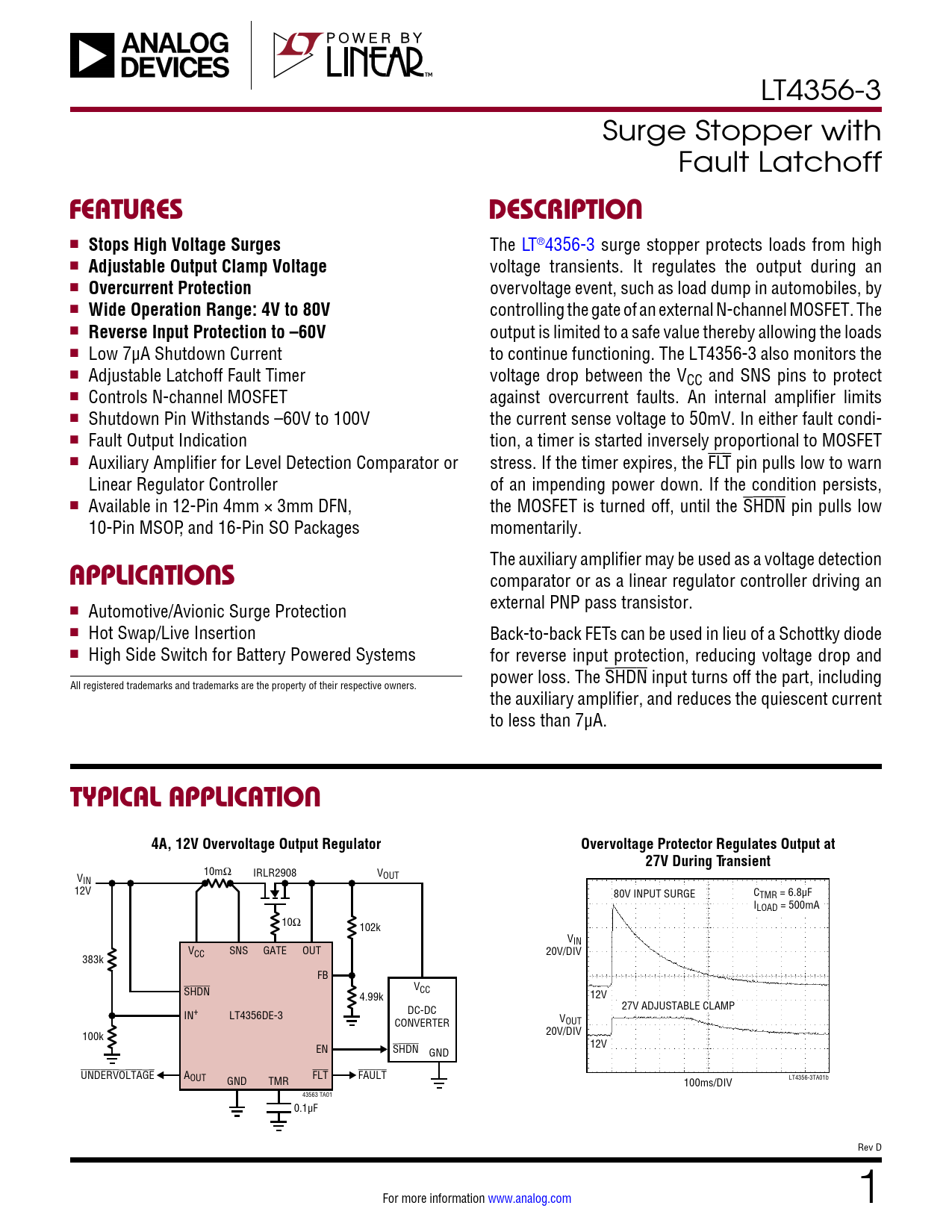 LT4356-3 Surge Stopper with Fault Latchoff FEATURESDESCRIPTION n Stops High Voltage Surges The LT®4356-3 surge stopper protects loads from high n Adjustable Output Clamp Voltage voltage transients. It regulates the output during an n Overcurrent Protection overvoltage event, such as load dump in automobiles, by n Wide Operation Range: 4V to 80V controlling the gate of an external N-channel MOSFET. The n Reverse Input Protection to –60V output is limited to a safe value thereby allowing the loads n Low 7µA Shutdown Current to continue functioning. The LT4356-3 also monitors the n Adjustable Latchoff Fault Timer voltage drop between the VCC and SNS pins to protect n Controls N-channel MOSFET against overcurrent faults. An internal amplifier limits n Shutdown Pin Withstands –60V to 100V the current sense voltage to 50mV. In either fault condi- n Fault Output Indication tion, a timer is started inversely proportional to MOSFET n Auxiliary Amplifier for Level Detection Comparator or stress. If the timer expires, the FLT pin pulls low to warn Linear Regulator Controller of an impending power down. If the condition persists, n Available in 12-Pin 4mm × 3mm DFN, the MOSFET is turned off, until the SHDN pin pulls low 10-Pin MSOP, and 16-Pin SO Packages momentarily. APPLICATIONS The auxiliary amplifier may be used as a voltage detection comparator or as a linear regulator controller driving an n external PNP pass transistor. Automotive/Avionic Surge Protection n Hot Swap/Live Insertion Back-to-back FETs can be used in lieu of a Schottky diode n High Side Switch for Battery Powered Systems for reverse input protection, reducing voltage drop and power loss. The SHDN input turns off the part, including All registered trademarks and trademarks are the property of their respective owners. the auxiliary amplifier, and reduces the quiescent current to less than 7µA. TYPICAL APPLICATION4A, 12V Overvoltage Output RegulatorOvervoltage Protector Regulates Output at27V During Transient 10mΩ IRLR2908 V V IN OUT 12V 80V INPUT SURGE CTMR = 6.8µF ILOAD = 500mA 10Ω 102k VIN VCC SNS GATE OUT 20V/DIV 383k FB SHDN VCC 4.99k 12V 27V ADJUSTABLE CLAMP IN+ LT4356DE-3 DC-DC CONVERTER VOUT 100k 20V/DIV EN SHDN 12V GND UNDERVOLTAGE AOUT GND TMR FLT FAULT 100ms/DIV LT4356-3TA01b 43563 TA01 0.1µF Rev D For more information www.analog.com 1 Document Outline Features Applications Description Typical Application Absolute Maximum Ratings Pin Configuration Electrical Characteristics Typical Performance Characteristics Pin Functions Block Diagram Operation Applications Information Typical Applications Revision History Typical Application .18702 Applications Typical Application Description Absolute Maximum Ratings Pin Configuration Order Information Electrical Characteristics Typical Performance Characteristics Pin Functions Block Diagram Operation Applications Information Typical Applications Package Description Revision History Typical Application Related parts