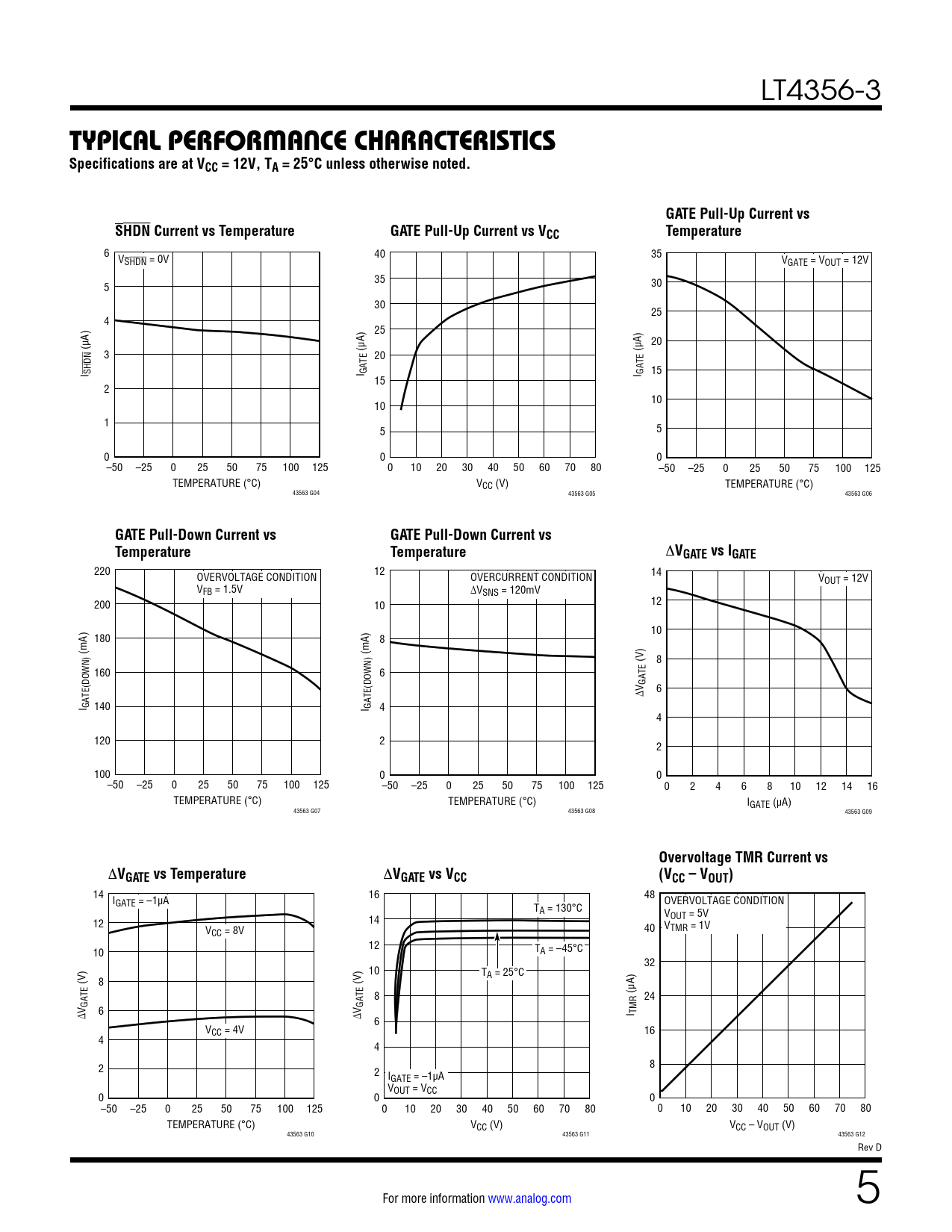 6 V 40 35 SHDN = 0V VGATE = VOUT = 12V 35 5 30 30 25 4 25 20 (µA) 3 (µA) 20 (µA) I SHDN I GATE I GATE 15 15 2 10 10 1 5 5 0 0 0 –50 –25 0 25 50 75 100 125 0 10 20 30 40 50 60 70 80 –50 –25 0 25 50 75 100 125 TEMPERATURE (°C) VCC (V) TEMPERATURE (°C) 43563 G04 43563 G05 43563 G06
