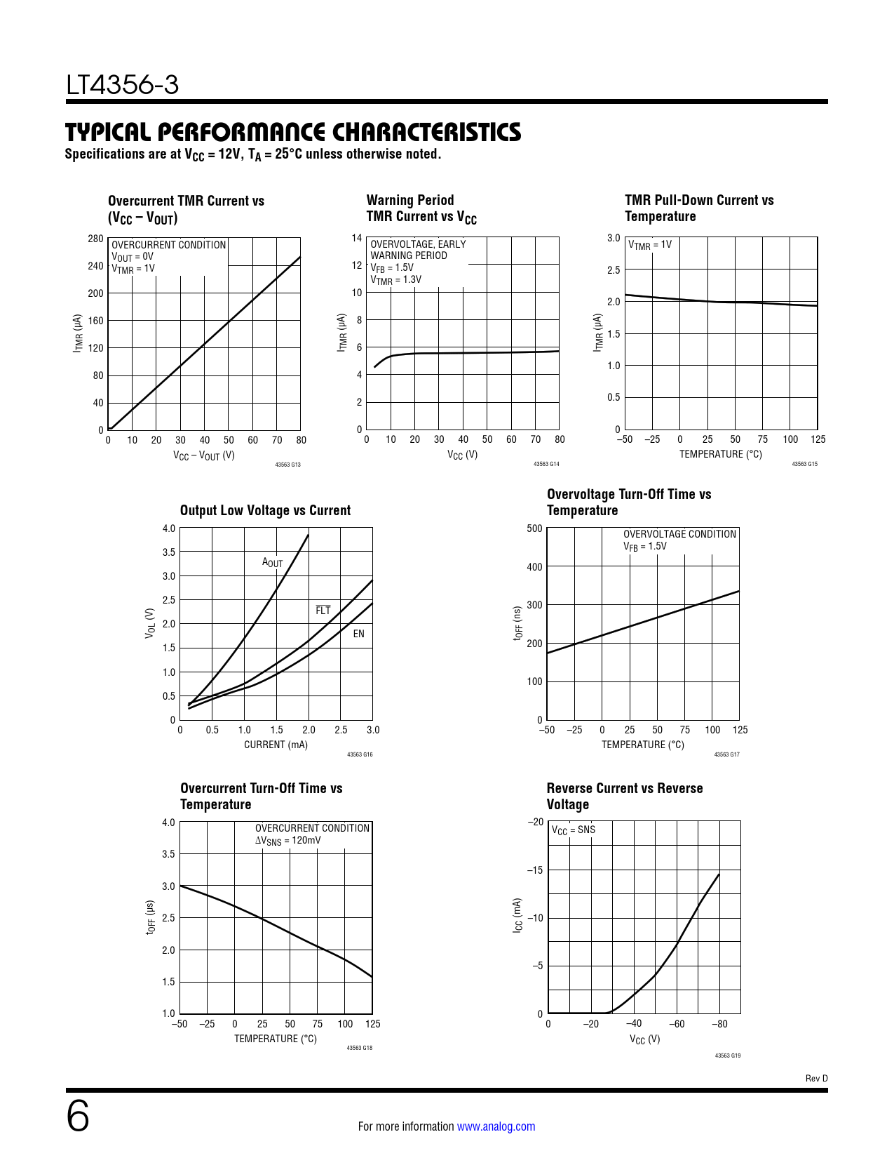 4.0 OVERCURRENT CONDITION –20 VCC = SNS ∆VSNS = 120mV 3.5 –15 3.0 (µs) 2.5 (mA) –10 t OFF I CC 2.0 –5 1.5 1.0 0 –50 –25 0 25 50 75 100 125 0 –20 –40 –60 –80 TEMPERATURE (°C) VCC (V) 43563 G18 43563 G19 Rev D 6 For more information www.analog.com Document Outline Features Applications Description Typical Application Absolute Maximum Ratings Pin Configuration Electrical Characteristics Typical Performance Characteristics Pin Functions Block Diagram Operation Applications Information Typical Applications Revision History Typical Application .18702 Applications Typical Application Description Absolute Maximum Ratings Pin Configuration Order Information Electrical Characteristics Typical Performance Characteristics Pin Functions Block Diagram Operation Applications Information Typical Applications Package Description Revision History Typical Application Related parts