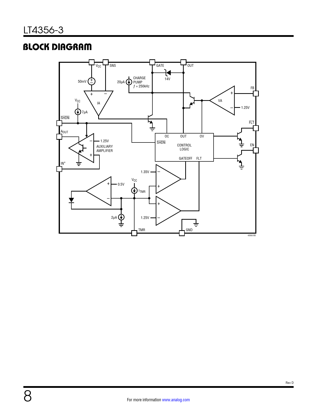 VCC SNS GATE OUT + CHARGE 14V 50mV – 20µA PUMP ƒ = 250kHz FB + + – VCC VA IA – 1.25V 7µA SHDN FLT AOUT – OC OUT OV 1.25V SHDN AUXILIARY CONTROL EN + AMPLIFIER LOGIC GATEOFF FLT IN+ 1.35V – VCC + 0.5V + ITMR – + 2µA 1.25V – TMR GND 43563 BD Rev D 8 For more information www.analog.com Document Outline Features Applications Description Typical Application Absolute Maximum Ratings Pin Configuration Electrical Characteristics Typical Performance Characteristics Pin Functions Block Diagram Operation Applications Information Typical Applications Revision History Typical Application .18702 Applications Typical Application Description Absolute Maximum Ratings Pin Configuration Order Information Electrical Characteristics Typical Performance Characteristics Pin Functions Block Diagram Operation Applications Information Typical Applications Package Description Revision History Typical Application Related parts