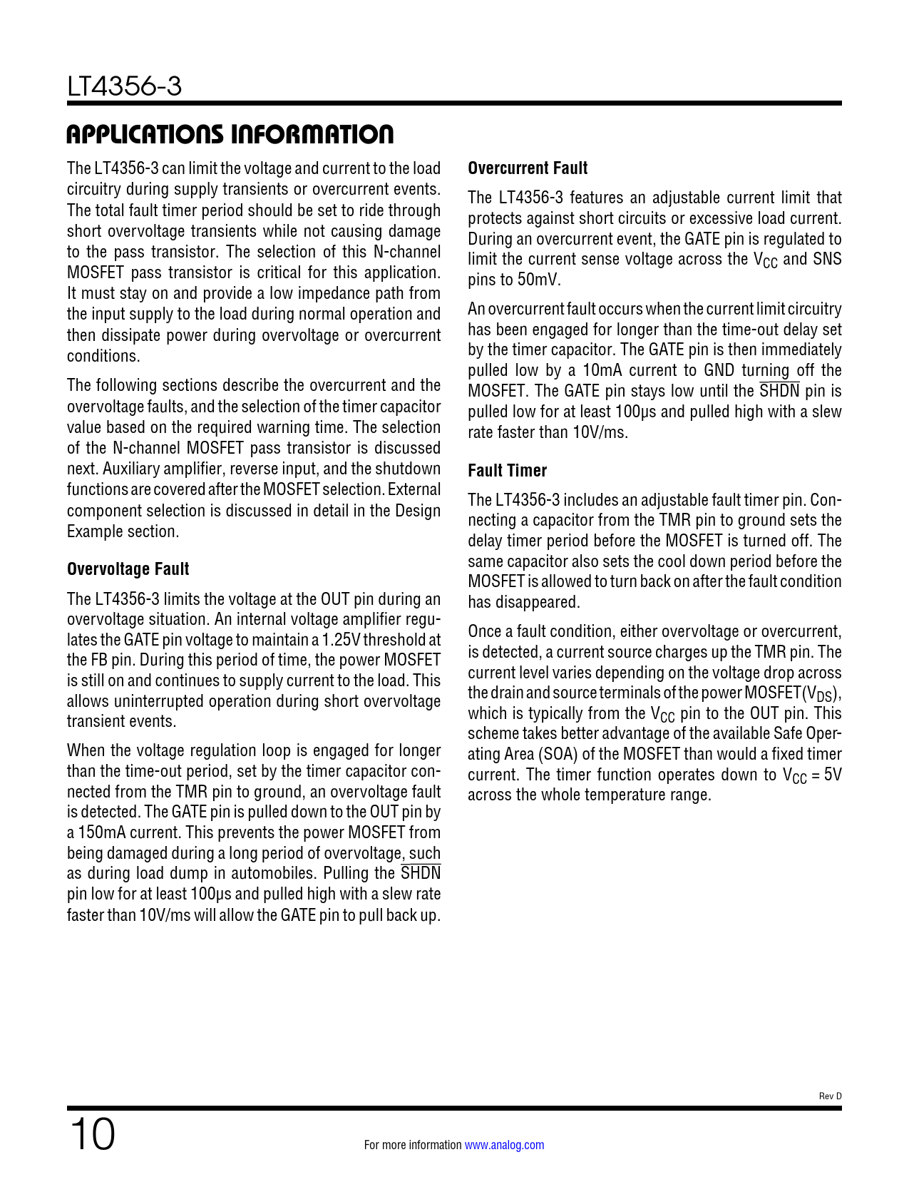 LT4356-3 APPLICATIONS INFORMATION The LT4356-3 can limit the voltage and current to the load Overcurrent Fault circuitry during supply transients or overcurrent events. The LT4356-3 features an adjustable current limit that The total fault timer period should be set to ride through protects against short circuits or excessive load current. short overvoltage transients while not causing damage During an overcurrent event, the GATE pin is regulated to to the pass transistor. The selection of this N-channel limit the current sense voltage across the V MOSFET pass transistor is critical for this application. CC and SNS pins to 50mV. It must stay on and provide a low impedance path from the input supply to the load during normal operation and An overcurrent fault occurs when the current limit circuitry then dissipate power during overvoltage or overcurrent has been engaged for longer than the time-out delay set conditions. by the timer capacitor. The GATE pin is then immediately pulled low by a 10mA current to GND turning off the The following sections describe the overcurrent and the MOSFET. The GATE pin stays low until the SHDN pin is overvoltage faults, and the selection of the timer capacitor pulled low for at least 100µs and pulled high with a slew value based on the required warning time. The selection rate faster than 10V/ms. of the N-channel MOSFET pass transistor is discussed next. Auxiliary amplifier, reverse input, and the shutdown Fault Timer functions are covered after the MOSFET selection. External component selection is discussed in detail in the Design The LT4356-3 includes an adjustable fault timer pin. Con- Example section. necting a capacitor from the TMR pin to ground sets the delay timer period before the MOSFET is turned off. The Overvoltage Fault same capacitor also sets the cool down period before the MOSFET is allowed to turn back on after the fault condition The LT4356-3 limits the voltage at the OUT pin during an has disappeared. overvoltage situation. An internal voltage amplifier regu- lates the GATE pin voltage to maintain a 1.25V threshold at Once a fault condition, either overvoltage or overcurrent, the FB pin. During this period of time, the power MOSFET is detected, a current source charges up the TMR pin. The is still on and continues to supply current to the load. This current level varies depending on the voltage drop across allows uninterrupted operation during short overvoltage the drain and source terminals of the power MOSFET(VDS), transient events. which is typically from the VCC pin to the OUT pin. This scheme takes better advantage of the available Safe Oper- When the voltage regulation loop is engaged for longer ating Area (SOA) of the MOSFET than would a fixed timer than the time-out period, set by the timer capacitor con- current. The timer function operates down to VCC = 5V nected from the TMR pin to ground, an overvoltage fault across the whole temperature range. is detected. The GATE pin is pulled down to the OUT pin by a 150mA current. This prevents the power MOSFET from being damaged during a long period of overvoltage, such as during load dump in automobiles. Pulling the SHDN pin low for at least 100µs and pulled high with a slew rate faster than 10V/ms will allow the GATE pin to pull back up. Rev D 10 For more information www.analog.com Document Outline Features Applications Description Typical Application Absolute Maximum Ratings Pin Configuration Electrical Characteristics Typical Performance Characteristics Pin Functions Block Diagram Operation Applications Information Typical Applications Revision History Typical Application .18702 Applications Typical Application Description Absolute Maximum Ratings Pin Configuration Order Information Electrical Characteristics Typical Performance Characteristics Pin Functions Block Diagram Operation Applications Information Typical Applications Package Description Revision History Typical Application Related parts
