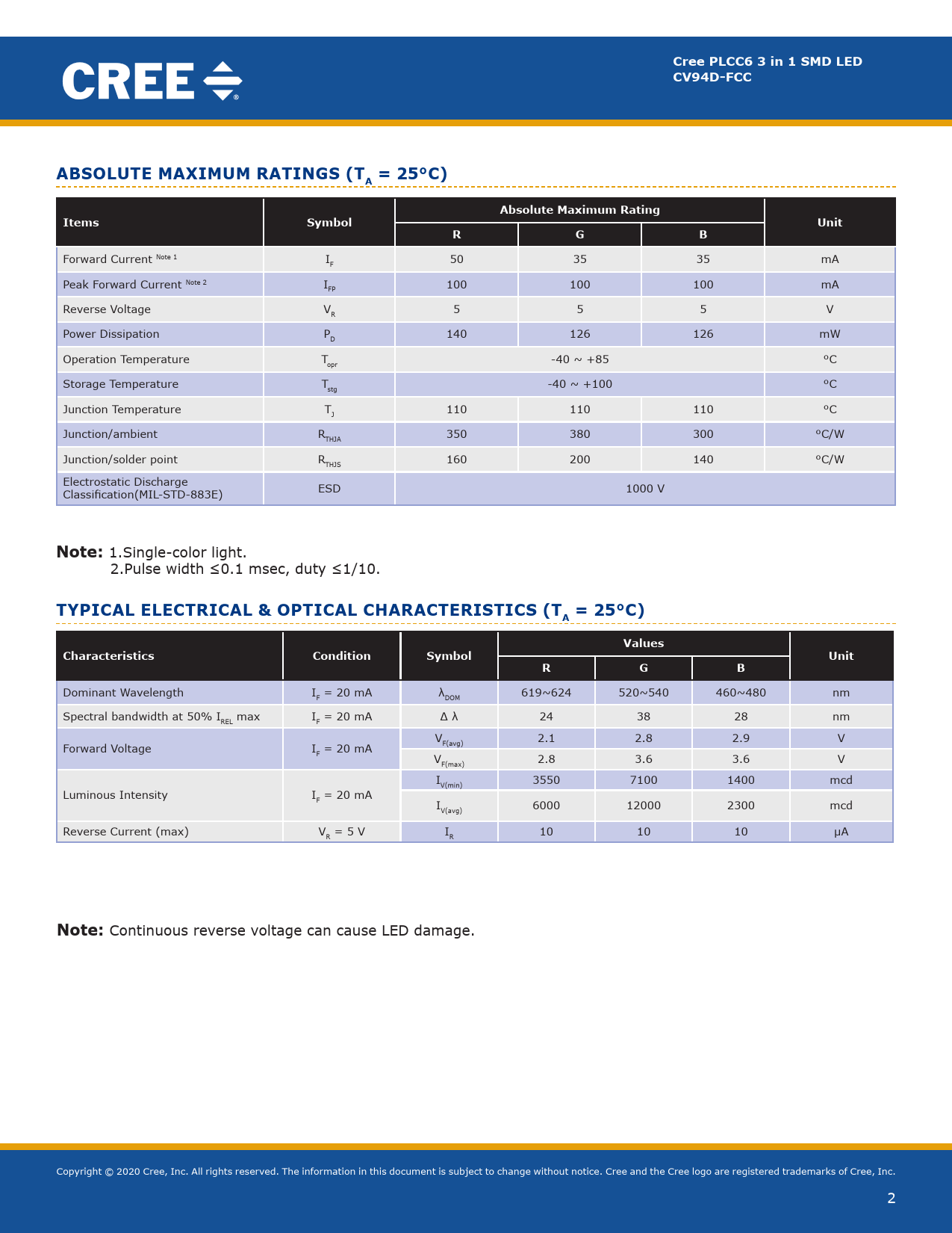 Cree PLCC6 3 in 1 SMD LED. CV94D-FCC. ABSOLUTE MAXIMUM RATINGS (T = 25°C). Absolute Maximum Rating. Items. Symbol. Unit. Note: