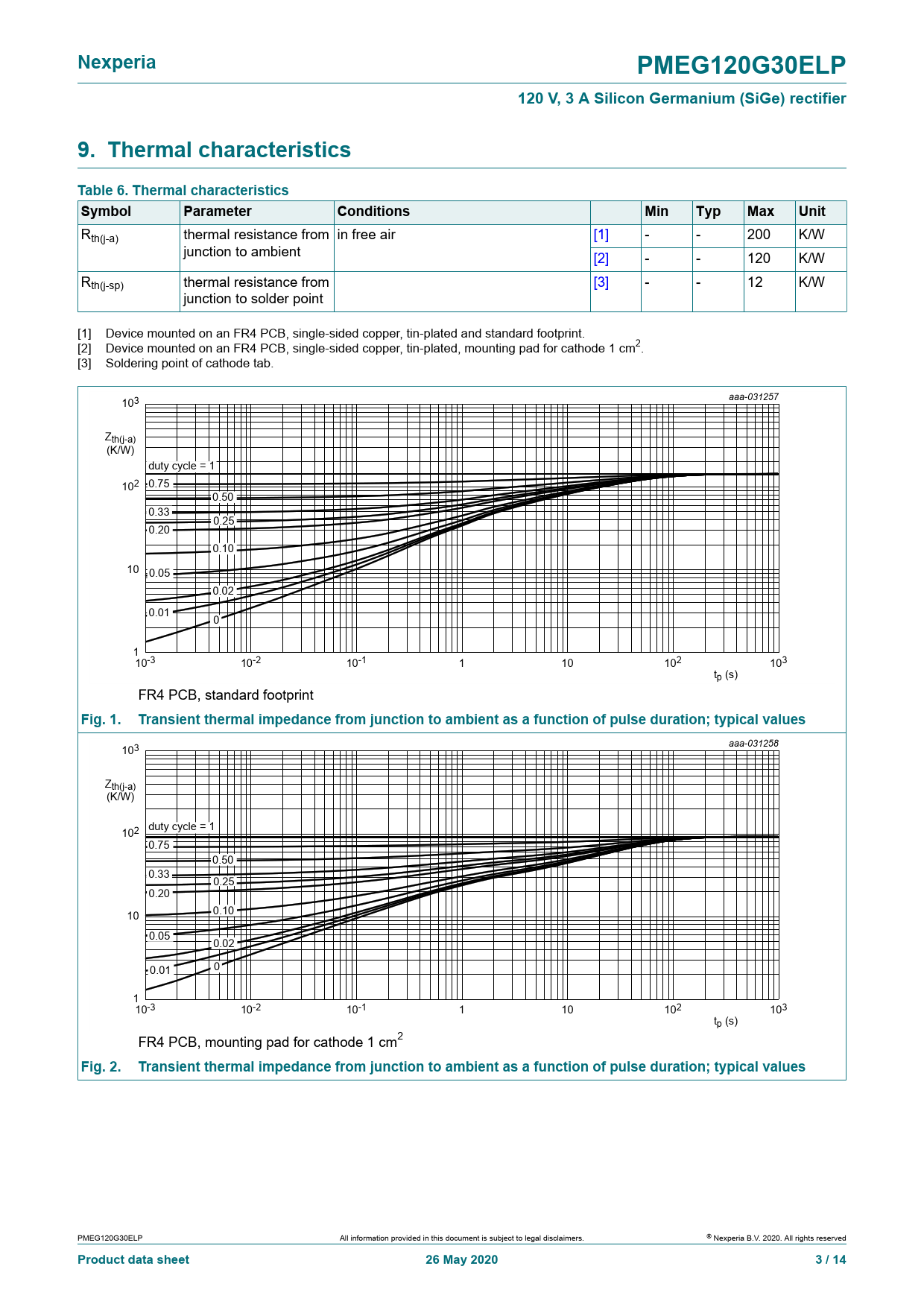 Nexperia PMEG120G30ELP 120 V, 3 A Silicon Germanium (SiGe) rectifier 9. Thermal characteristics Table 6. Thermal characteristics Symbol Parameter Conditions Min Typ Max Unit