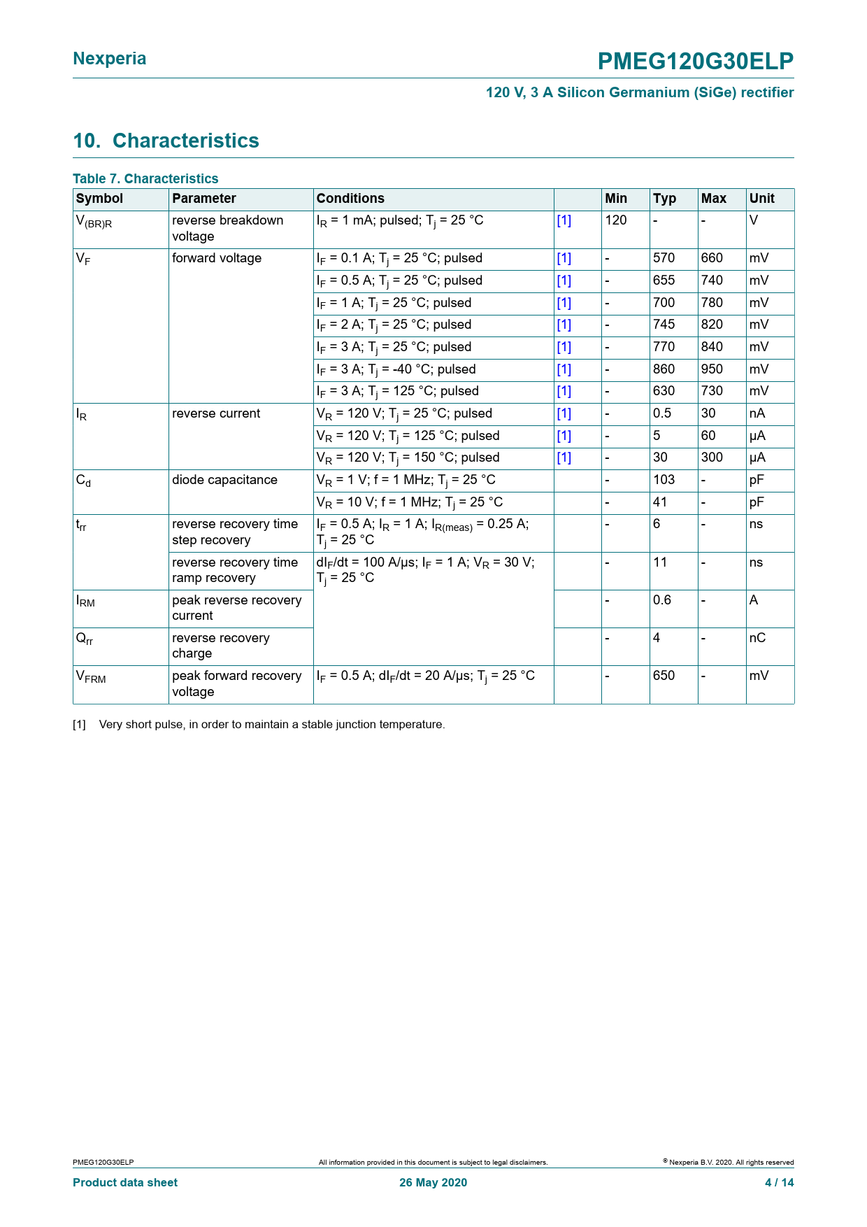 Nexperia. PMEG120G30ELP. 120 V, 3 A Silicon Germanium (SiGe) rectifier. 10. Characteristics Table 7. Characteristics. Symbol