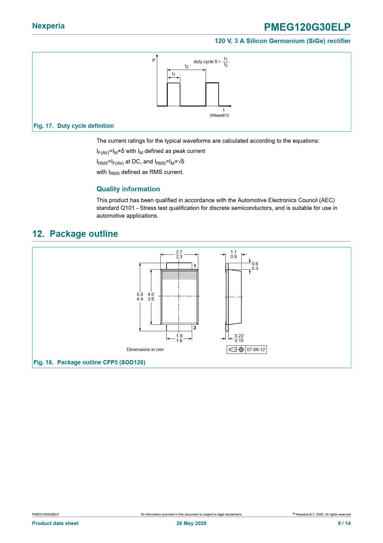 Nexperia. PMEG120G30ELP. 120 V, 3 A Silicon Germanium (SiGe) rectifier. Fig. 17. Duty cycle definition. Quality information