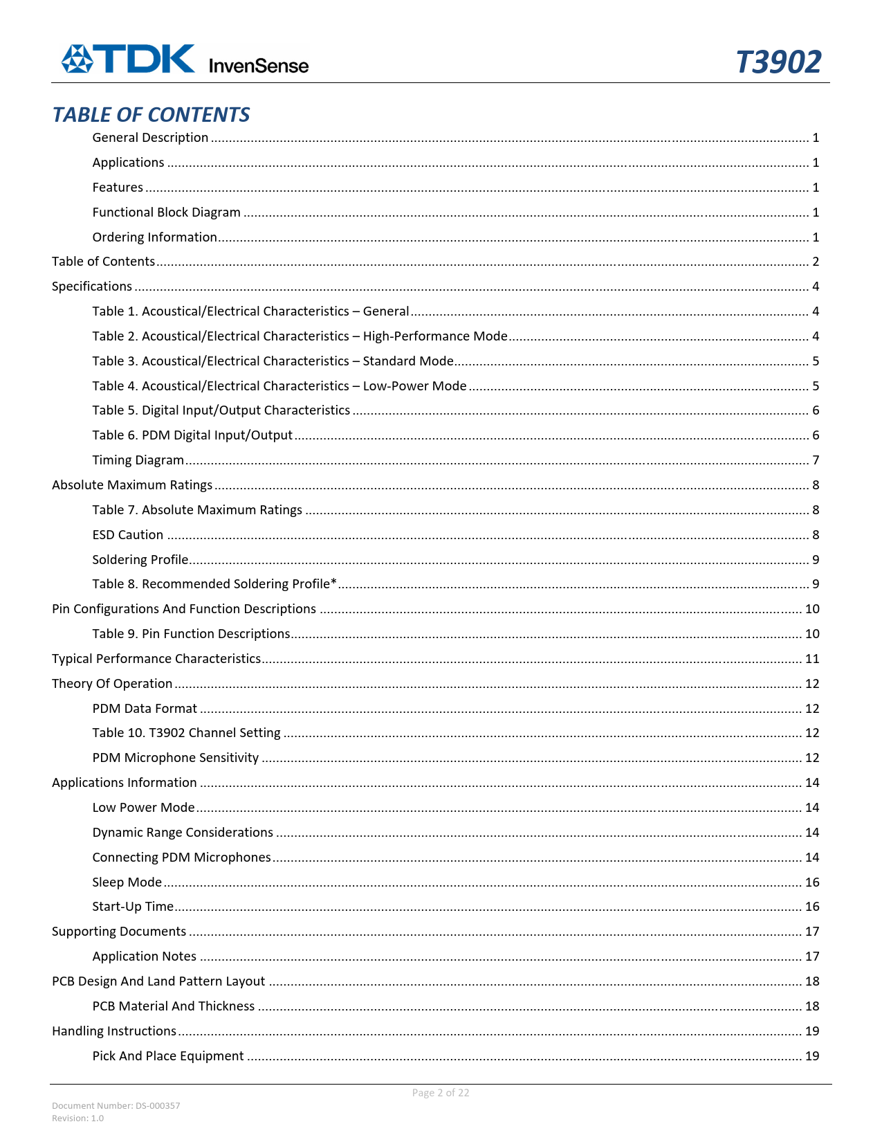 General Description ... 1 Applications ... 1 Features ... 1 Functional Block Diagram .. 1 Ordering Information ... 1 Table of Contents .. 2 Specifications .. 4 Table 1. Acoustical/Electrical Characteristics – General .. 4 Table 2. Acoustical/Electrical Characteristics – High‐Performance Mode ... 4 Table 3. Acoustical/Electrical Characteristics – Standard Mode .. 5 Table 4. Acoustical/Electrical Characteristics – Low‐Power Mode .. 5 Table 5. Digital Input/Output Characteristics .. 6 Table 6. PDM Digital Input/Output .. 6 Timing Diagram .. 7 Absolute Maximum Ratings .. 8 Table 7. Absolute Maximum Ratings ... 8 ESD Caution ... 8 Soldering Profile ... 9 Table 8. Recommended Soldering Profile* .. 9 Pin Configurations And Function Descriptions ... 10 Table 9. Pin Function Descriptions ... 10 Typical Performance Characteristics ... 11 Theory Of Operation ... 12 PDM Data Format .. 12 Table 10. T3902 Channel Setting ... 12 PDM Microphone Sensitivity ... 12 Applications Information .. 14 Low Power Mode ... 14 Dynamic Range Considerations ... 14 Connecting PDM Microphones .. 14 Sleep Mode .. 16 Start‐Up Time ... 16 Supporting Documents ... 17 Application Notes .. 17 PCB Design And Land Pattern Layout ... 18 PCB Material And Thickness .. 18 Handling Instructions .. 19 Pick And Place Equipment ... 19 Page 2 of 22 Document Number: DS‐000357 Revision: 1.0