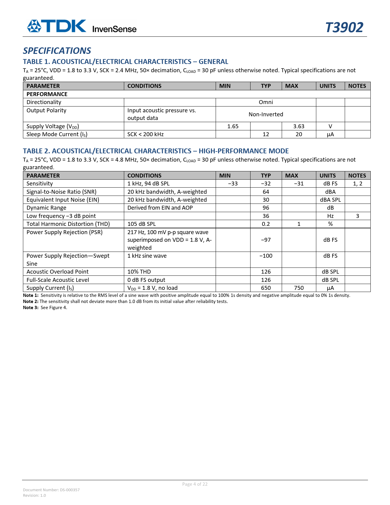 T3902. SPECIFICATIONS  . TABLE 1. ACOUSTICAL/ELECTRICAL CHARACTERISTICS – GENERAL . PARAMETER   . CONDITIONS . MIN . TYP . MAX