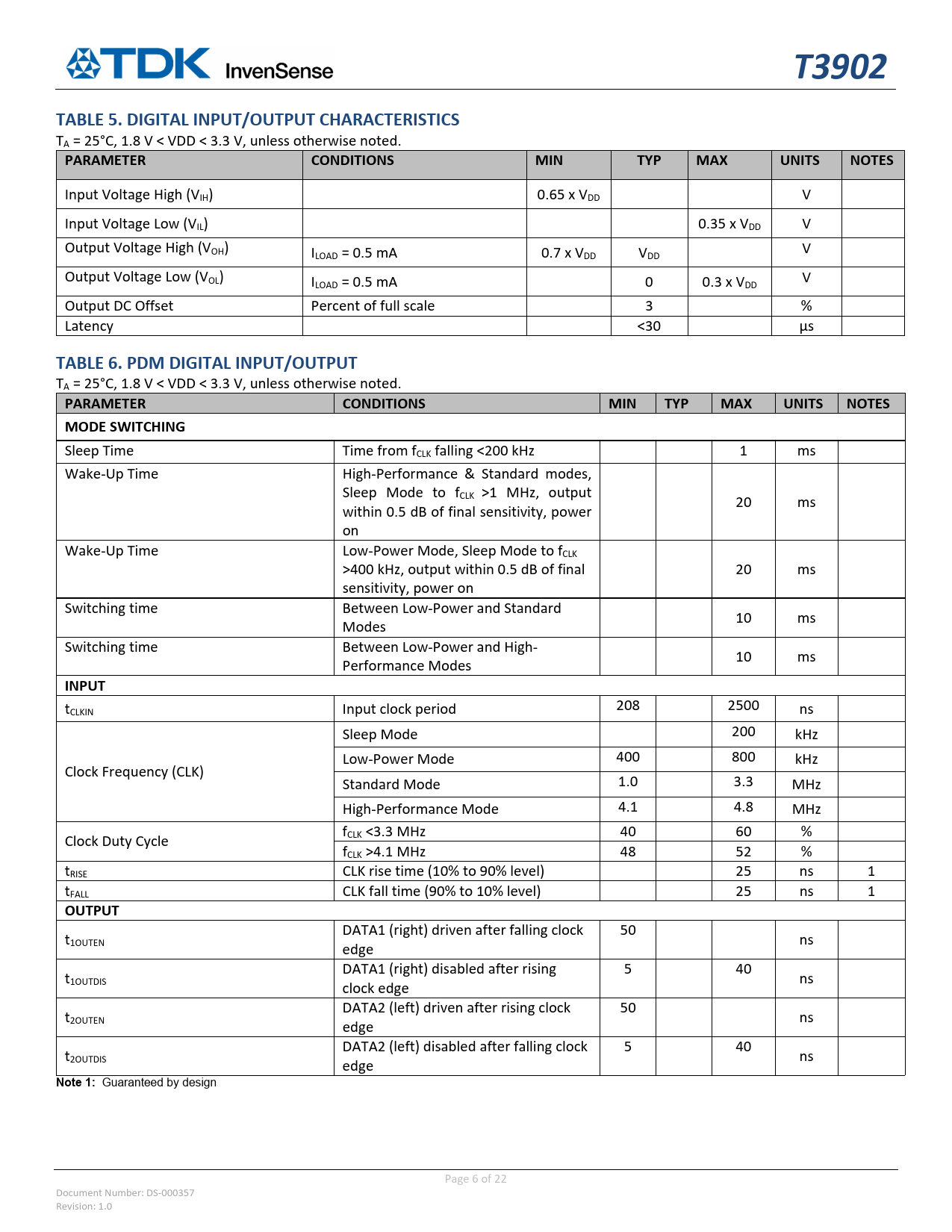 TABLE 5. DIGITAL INPUT/OUTPUT CHARACTERISTICS TA = 25°C, 1.8 V < VDD < 3.3 V, unless otherwise noted. PARAMETER CONDITIONS MIN TYP MAX UNITS NOTES Input Voltage High (VIH) 0.65 x VDD V Input Voltage Low (VIL) 0.35 x VDD V Output Voltage High (VOH) ILOAD = 0.5 mA 0.7 x VDD VDD V Output Voltage Low (VOL) ILOAD = 0.5 mA 0 0.3 x VDD V Output DC Offset Percent of full scale 3 % Latency <30 µs TABLE 6. PDM DIGITAL INPUT/OUTPUT TA = 25°C, 1.8 V < VDD < 3.3 V, unless otherwise noted. PARAMETER CONDITIONS MIN TYP MAX UNITS NOTES MODE SWITCHING Sleep Time Time from fCLK falling <200 kHz 1 ms Wake‐Up Time High‐Performance & Standard modes, Sleep Mode to fCLK >1 MHz, output 20 ms within 0.5 dB of final sensitivity, power on Wake‐Up Time Low‐Power Mode, Sleep Mode to fCLK >400 kHz, output within 0.5 dB of final 20 ms sensitivity, power on Switching time Between Low‐Power and Standard 10 ms Modes Switching time Between Low‐Power and High‐ 10 ms Performance Modes INPUT tCLKIN Input clock period 208 2500 ns Sleep Mode 200 kHz Low‐Power Mode 400 800 kHz Clock Frequency (CLK) Standard Mode 1.0 3.3 MHz High‐Performance Mode 4.1 4.8 MHz f Clock Duty Cycle CLK <3.3 MHz 40 60 % fCLK >4.1 MHz 48 52 % tRISE CLK rise time (10% to 90% level) 25 ns 1 tFALL CLK fall time (90% to 10% level) 25 ns 1 OUTPUT DATA1 (right) driven after falling clock 50 t1OUTEN ns edge DATA1 (right) disabled after rising 5 40 t1OUTDIS ns clock edge DATA2 (left) driven after rising clock 50 t2OUTEN ns edge DATA2 (left) disabled after falling clock 5 40 t2OUTDIS ns edge Note 1: Guaranteed by design Page 6 of 22 Document Number: DS‐000357 Revision: 1.0