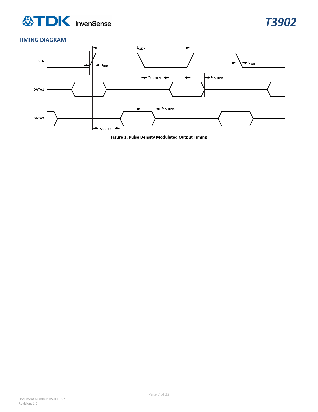 TIMING DIAGRAM tCLKIN CLK t t FALL RISE t1OUTEN t1OUTDIS DATA1 t2OUTDIS DATA2 t2OUTEN Figure 1. Pulse Density Modulated Output Timing