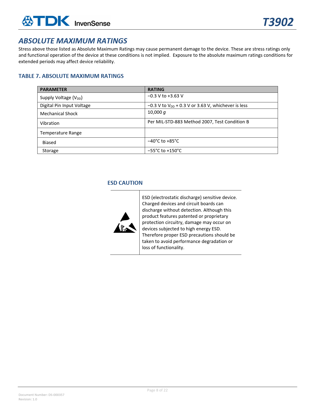 T3902. ABSOLUTE MAXIMUM RATINGS .   TABLE 7. ABSOLUTE MAXIMUM RATINGS . PARAMETER . RATING . ESD CAUTION