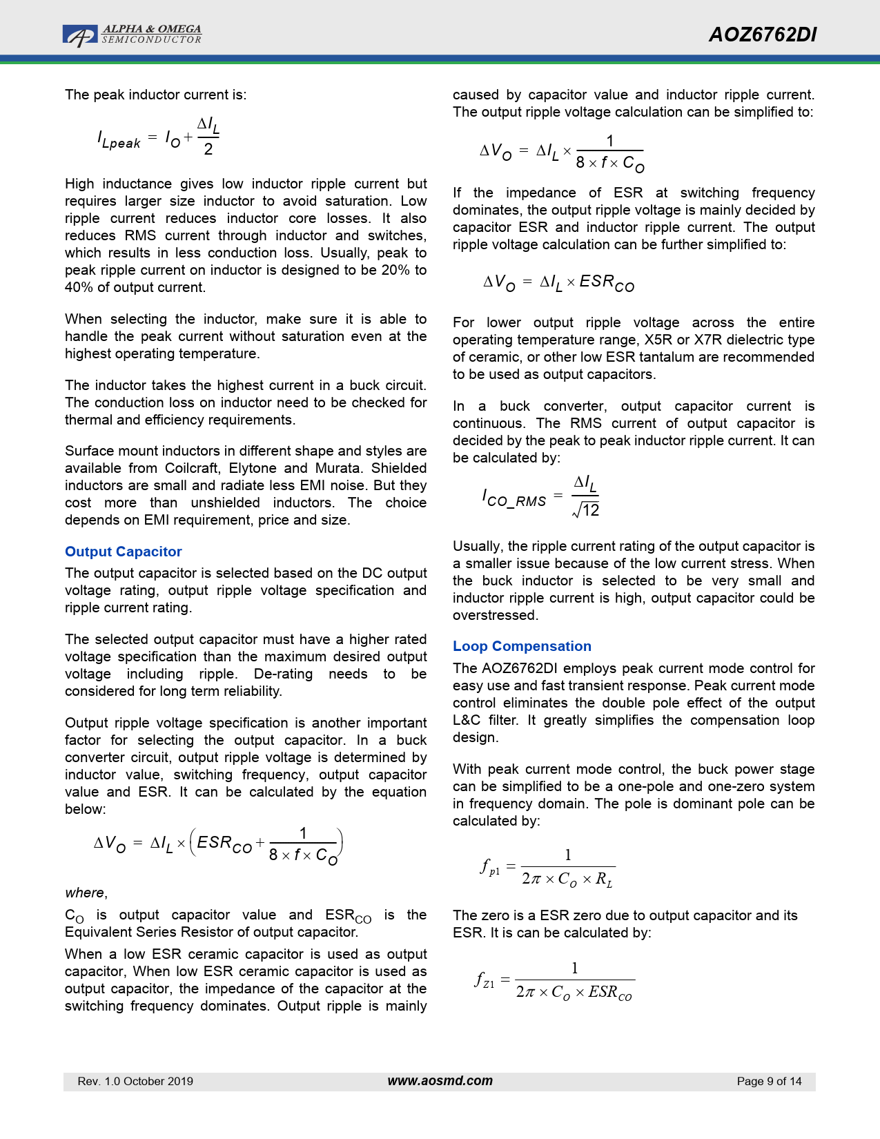 页数 / 页14 / 9 — AOZ6762DI. Output Capacitor. Loop Compensation. www.aosmd.com