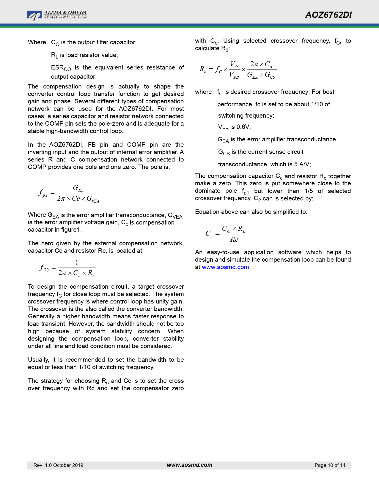 Where C with C O is the output filter capacitor; c. Using selected crossover frequency, fC, to calculate R3: RL is load resistor value; V  2  C ESRCO is the equivalent series resistance of O o R  f   c C output capacitor; V G  G FB EA CS The compensation design is actually to shape the converter control loop transfer function to get desired where fC is desired crossover frequency. For best gain and phase. Several different types of compensation performance, fc is set to be about 1/10 of network can be used for the AOZ6762DI. For most cases, a series capacitor and resistor network connected switching frequency; to the COMP pin sets the pole-zero and is adequate for a V stable high-bandwidth control loop. FB is 0.6V; G In the AOZ6762DI, FB pin and COMP pin are the EA is the error amplifier transconductance, inverting input and the output of internal error amplifier. A GCS is the current sense circuit series R and C compensation network connected to COMP provides one pole and one zero. The pole is: transconductance, which is 5 A/V; The compensation capacitor Cc and resistor Rc together make a zero. This zero is put somewhere close to the GEA dominate pole f f  p1 but lower than 1/5 of selected p2  2  Cc  G crossover frequency. C VEA 2 can is selected by: Where G Equation above can also be simplified to: EA is the error amplifier transconductance, GVEA is the error amplifier voltage gain, Cc is compensation capacitor in figure1. C  R C O L  c Rc The zero given by the external compensation network, capacitor Cc and resistor Rc, is located at: An easy-to-use application software which helps to design and simulate the compensation loop can be found 1 f  at www.aosmd.com. Z 2  2  C  R c c To design the compensation circuit, a target crossover frequency fC for close loop must be selected. The system crossover frequency is where control loop has unity gain. The crossover is the also called the converter bandwidth. Generally a higher bandwidth means faster response to load transient. However, the bandwidth should not be too high because of system stability concern. When designing the compensation loop, converter stability under all line and load condition must be considered. Usually, it is recommended to set the bandwidth to be equal or less than 1/10 of switching frequency. The strategy for choosing Rc and Cc is to set the cross over frequency with Rc and set the compensator zero Rev. 1.0 October 2019