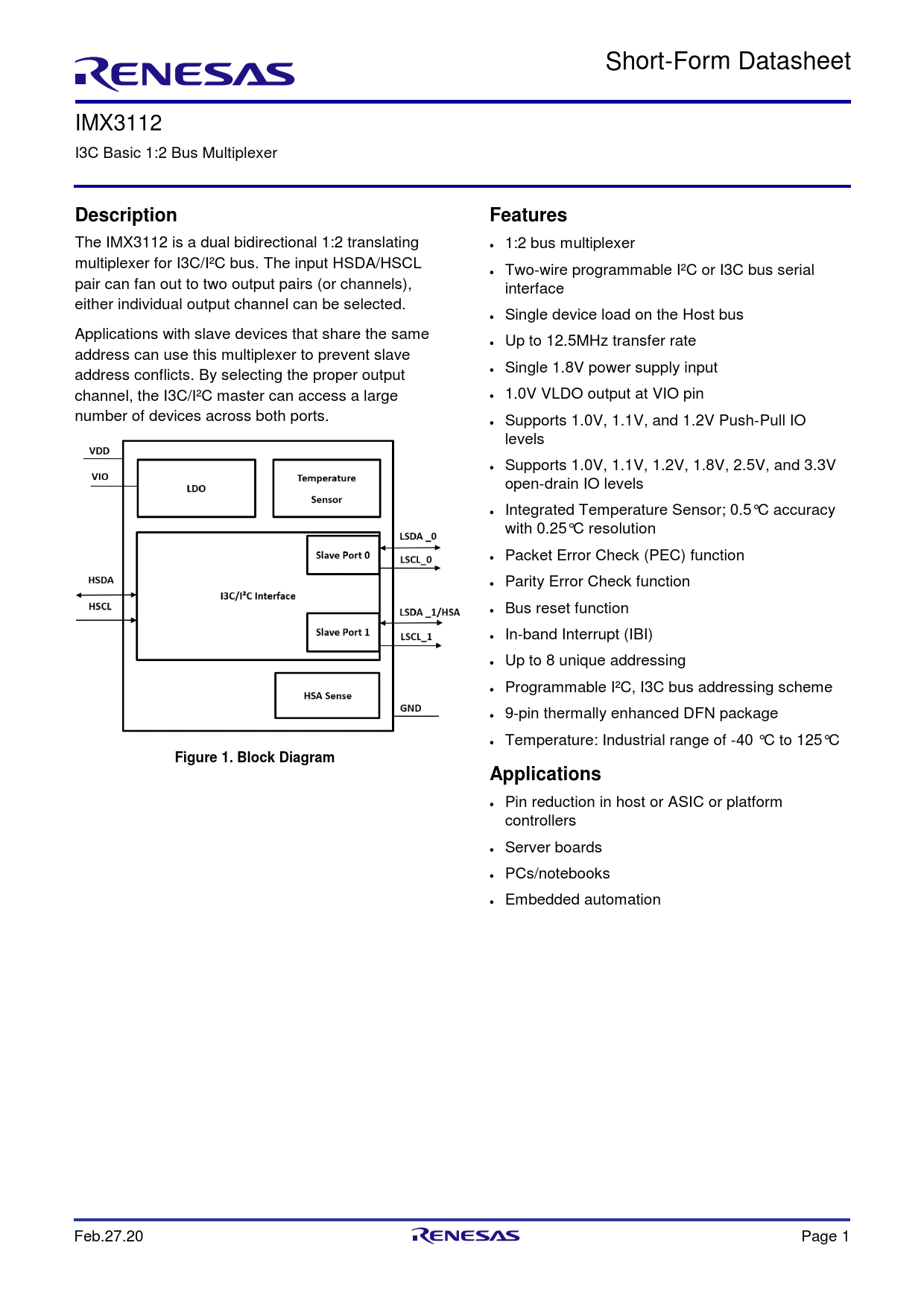 Short-Form Datasheet IMX3112 I3C Basic 1:2 Bus Multiplexer DescriptionFeatures The IMX3112 is a dual bidirectional 1:2 translating • 1:2 bus multiplexer multiplexer for I3C/I²C bus. The input HSDA/HSCL • Two-wire programmable I²C or I3C bus serial pair can fan out to two output pairs (or channels), interface either individual output channel can be selected. • Single device load on the Host bus Applications with slave devices that share the same • Up to 12.5MHz transfer rate address can use this multiplexer to prevent slave • address conflicts. By selecting the proper output Single 1.8V power supply input channel, the I3C/I²C master can access a large • 1.0V VLDO output at VIO pin number of devices across both ports. • Supports 1.0V, 1.1V, and 1.2V Push-Pull IO levels • Supports 1.0V, 1.1V, 1.2V, 1.8V, 2.5V, and 3.3V open-drain IO levels • Integrated Temperature Sensor; 0.5°C accuracy with 0.25°C resolution • Packet Error Check (PEC) function • Parity Error Check function • Bus reset function • In-band Interrupt (IBI) • Up to 8 unique addressing • Programmable I²C, I3C bus addressing scheme • 9-pin thermally enhanced DFN package • Temperature: Industrial range of -40 °C to 125°C Figure 1. Block DiagramApplications • Pin reduction in host or ASIC or platform controllers • Server boards • PCs/notebooks • Embedded automation Feb.27.20 Page 1