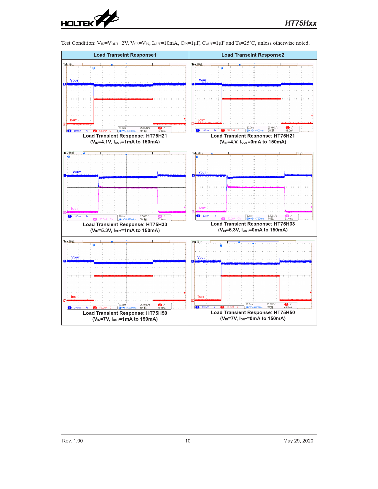 Load Transeint Response1 Load Transeint Response2 Load Transient Response: HT75H21 Load Transient Response: HT75H21 (VIN=4.1V, IOUT=1mA to 150mA) (VIN=4.V, IOUT=0mA to 150mA) Load Transient Response: HT75H33 Load Transient Response: HT75H33 (VIN=5.3V, IOUT=1mA to 150mA) (VIN=5.3V, IOUT=0mA to 150mA) Load Transient Response: HT75H50 Load Transient Response: HT75H50 (VIN=7V, IOUT=1mA to 150mA) (VIN=7V, IOUT=0mA to 150mA)