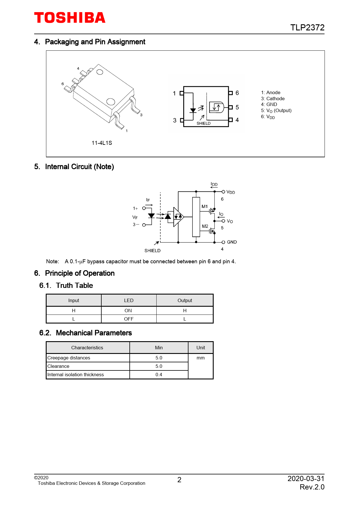 TLP2372. 4. Packaging. and. Pin. Assignment. 1:. Anode. 3:. Cathode. 4:. GND. 5:. VO. (Output). 6:. VDD. 11-4L1S. 5. Internal. Circuit. (Note). Note:. A. 0.1-µF. bypass