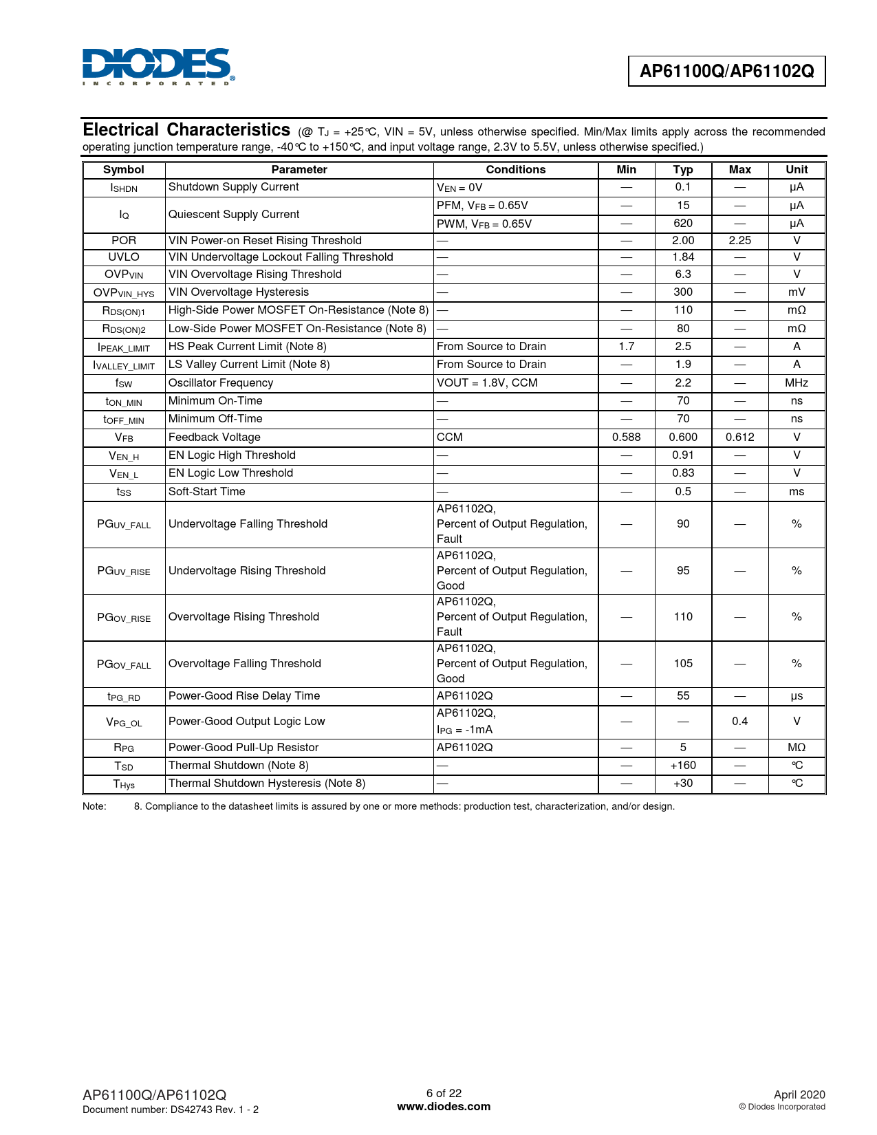 AP61100Q/AP61102Q. Electrical Characteristics. Symbol. Parameter. Conditions. Min. Typ. Max. Unit. www.diodes.com