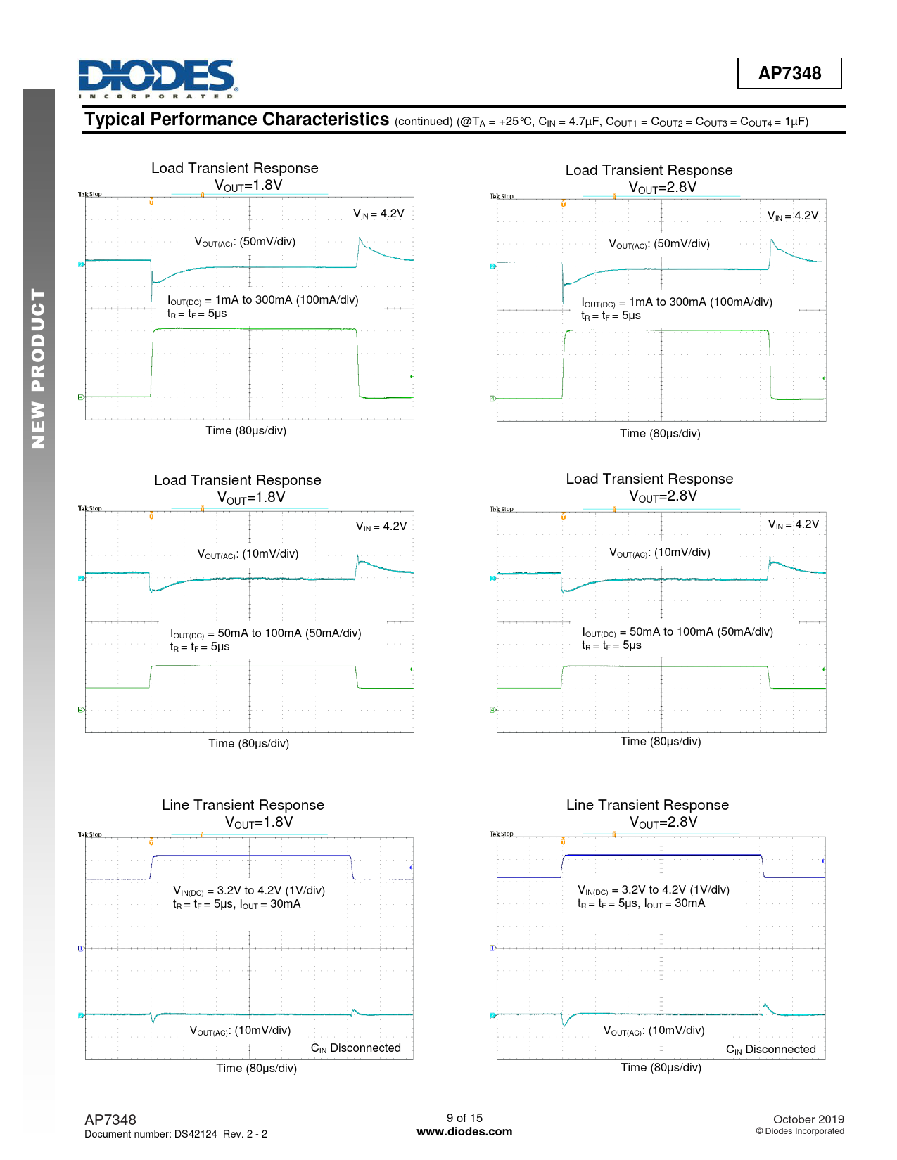 Time (80μs/div) Time (80μs/div) Load Transient Response Load Transient Response V V OUT=1.8V OUT=2.8V V V IN = 4.2V IN = 4.2V V V OUT(AC): (10mV/div) OUT(AC): (10mV/div) I I OUT(DC) = 50mA to 100mA (50mA/div) OUT(DC) = 50mA to 100mA (50mA/div) t t R = tF = 5μs R = tF = 5μs Time (80μs/div) Time (80μs/div) Line Transient Response Line Transient Response VOUT=1.8V VOUT=2.8V VIN(DC) = 3.2V to 4.2V (1V/div) VIN(DC) = 3.2V to 4.2V (1V/div) tR = tF = 5μs, IOUT = 30mA tR = tF = 5μs, IOUT = 30mA VOUT(AC): (10mV/div) VOUT(AC): (10mV/div) CIN Disconnected CIN Disconnected Time (80μs/div) Time (80μs/div) AP7348 9 of 15 October 2019 Document number: DS42124 Rev. 2 - 2