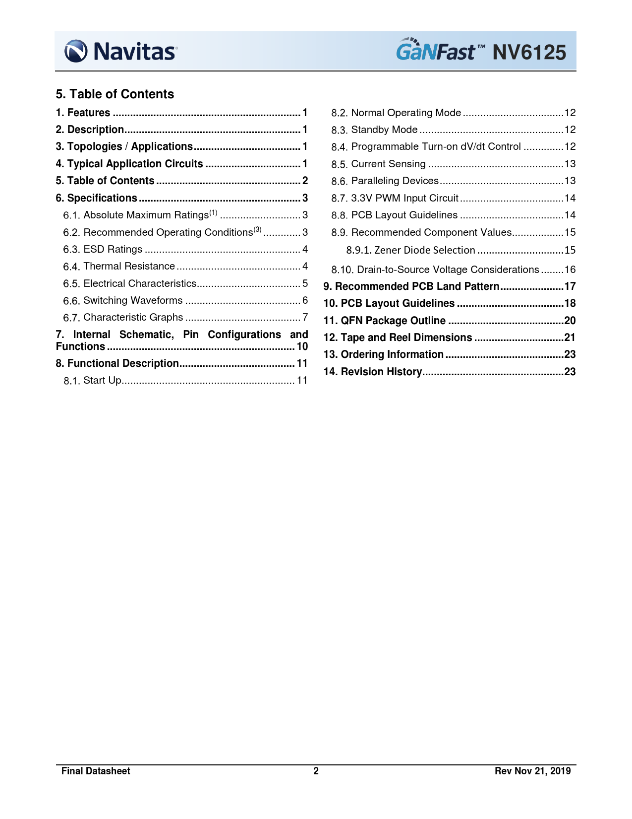 link to page 1 link to page 1 link to page 1 link to page 1 link to page 2 link to page 3 link to page 3 link to page 3 link to page 4 link to page 4 link to page 5 link to page 6 link to page 7 link to page 10 link to page 10 link to page 11 link to page 11 link to page 12 link to page 12 link to page 12 link to page 13 link to page 13 link to page 14 link to page 14 link to page 15 link to page 15 link to page 16 link to page 17 link to page 18 link to page 20 link to page 21 link to page 23 link to page 23 NV6125NV61255. Table of Contents1. Features ... 1 Normal Operating Mode ... 12 2. Description ... 1 Standby Mode .. 12 3. Topologies / Applications ... 1 Programmable Turn-on dV/dt Control .. 12 4. Typical Application Circuits ... 1 Current Sensing ... 13 5. Table of Contents .. 2 Paralleling Devices ... 13 6. Specifications .. 3 3.3V PWM Input Circuit .. 14 Absolute Maximum Ratings(1) .. 3 PCB Layout Guidelines .. 14 Recommended Operating Conditions(3) ... 3 Recommended Component Values.. 15 ESD Ratings .. 4 8.9.1. Zener Diode Selection .. 15 Thermal Resistance ... 4 Drain-to-Source Voltage Considerations .. 16 Electrical Characteristics .. 5 9. Recommended PCB Land Pattern .. 17 Switching Waveforms .. 6 10. PCB Layout Guidelines ... 18 Characteristic Graphs .. 7 11. QFN Package Outline .. 207. Internal Schematic, Pin Configurations and12. Tape and Reel Dimensions ... 21Functions ... 1013. Ordering Information ... 238. Functional Description .. 1114. Revision History... 23 Start Up .. 11 Final Datasheet2Rev Nov 21, 2019