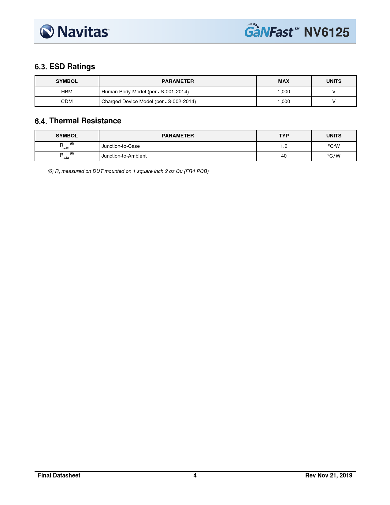 NV6125 ESD Ratings SYMBOL PARAMETER MAX UNITS Thermal Resistance TYP Final Datasheet Rev Nov 21, 2019