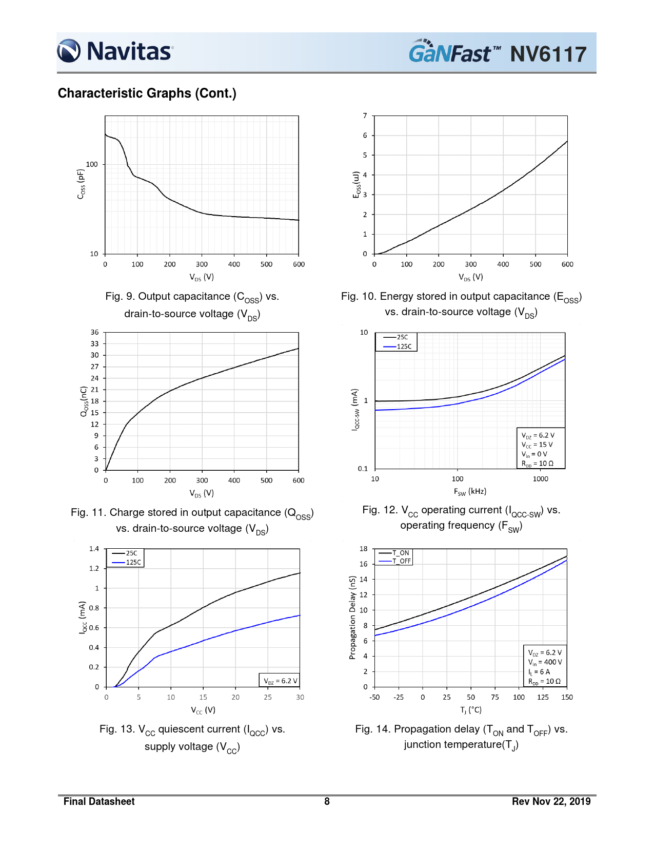 NV6117Characteristic Graphs (Cont.) Fig. 9. Output capacitance (C ) vs. Fig. 10. Energy stored in output capacitance (E ) OSS OSS drain-to-source voltage (V ) vs. drain-to-source voltage (V ) DS DS Fig. 11. Charge stored in output capacitance (Q ) Fig. 12. V operating current (I ) vs. OSS CC QCC-SW vs. drain-to-source voltage (V ) operating frequency (F ) DS SW Fig. 13. V quiescent current (I ) vs. Fig. 14. Propagation delay (T and T ) vs. CC QCC ON OFF supply voltage (V ) junction temperature(T ) CC J Final Datasheet8Rev Nov 22, 2019