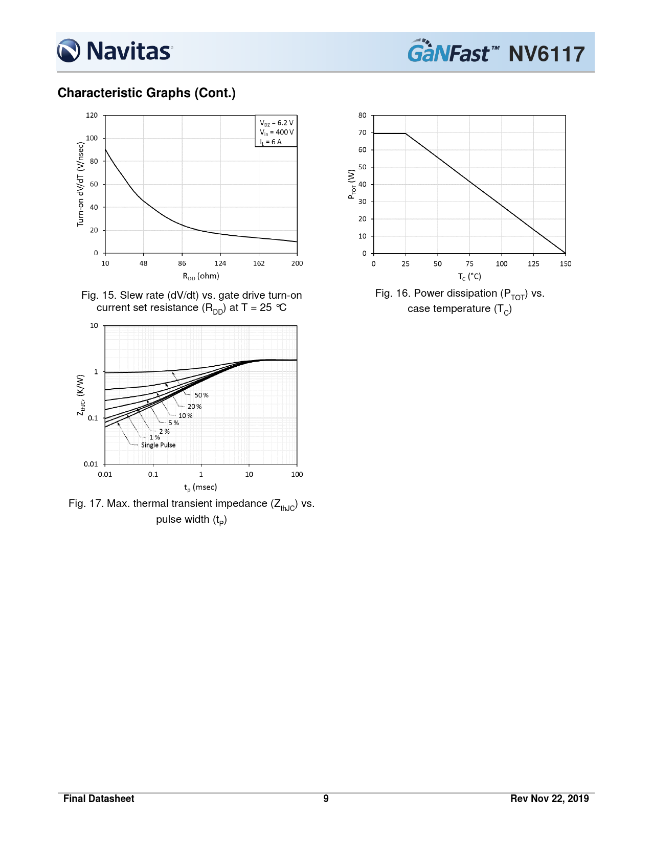 NV6117Characteristic Graphs (Cont.) Fig. 15. Slew rate (dV/dt) vs. gate drive turn-on Fig. 16. Power dissipation (P ) vs. TOT current set resistance (R ) at T = 25 °C case temperature (T ) DD C Fig. 17. Max. thermal transient impedance (Z ) vs. thJC pulse width (t ) P Final Datasheet9Rev Nov 22, 2019