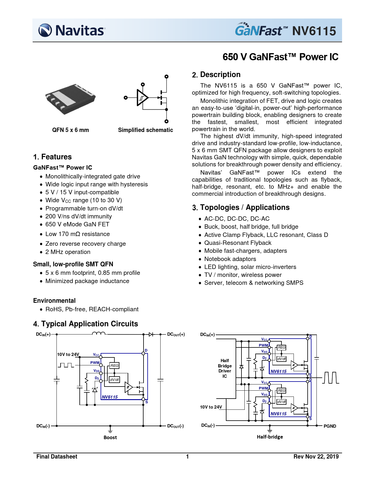 NV6115650 V GaNFast™ Power ICDescription The NV6115 is a 650 V GaNFast™ power IC, optimized for high frequency, soft-switching topologies. Monolithic integration of FET, drive and logic creates an easy-to-use ‘digital-in, power-out’ high-performance powertrain building block, enabling designers to create the fastest, smallest, most efficient integrated QFN 5 x 6 mmSimplified schematic powertrain in the world. The highest dV/dt immunity, high-speed integrated drive and industry-standard low-profile, low-inductance, 5 x 6 mm SMT QFN package allow designers to exploit Features Navitas GaN technology with simple, quick, dependable GaNFast™ Power IC solutions for breakthrough power density and efficiency. • Navitas’ GaNFast™ power ICs extend the Monolithically-integrated gate drive capabilities of traditional topologies such as flyback, • Wide logic input range with hysteresis half-bridge, resonant, etc. to MHz+ and enable the • 5 V / 15 V input-compatible commercial introduction of breakthrough designs. • Wide VCC range (10 to 30 V) • Programmable turn-on dV/dt Topologies / Applications • 200 V/ns dV/dt immunity • AC-DC, DC-DC, DC-AC • 650 V eMode GaN FET • Buck, boost, half bridge, full bridge • Low 170 mΩ resistance • Active Clamp Flyback, LLC resonant, Class D • Zero reverse recovery charge • Quasi-Resonant Flyback • 2 MHz operation • Mobile fast-chargers, adapters • Notebook adaptors Small, low-profile SMT QFN • LED lighting, solar micro-inverters • 5 x 6 mm footprint, 0.85 mm profile • TV / monitor, wireless power • Minimized package inductance • Server, telecom & networking SMPS Environmental • RoHS, Pb-free, REACH-compliant Typical Application CircuitsDCIN(+)DCOUT(+)DCIN(+)DVCCPWM REG DVDD10V to 24VVCCDZHalf dV/dt PWM REG BridgeVDDDriverNV6115SDICZ dV/dt DVCCPWM REG VNV6115DDSDZ dV/dt 10V to 24VNV6115SDCDCIN(-)DCOUT(-)IN(-)PGNDBoostHalf-bridgeFinal Datasheet1Rev Nov 22, 2019