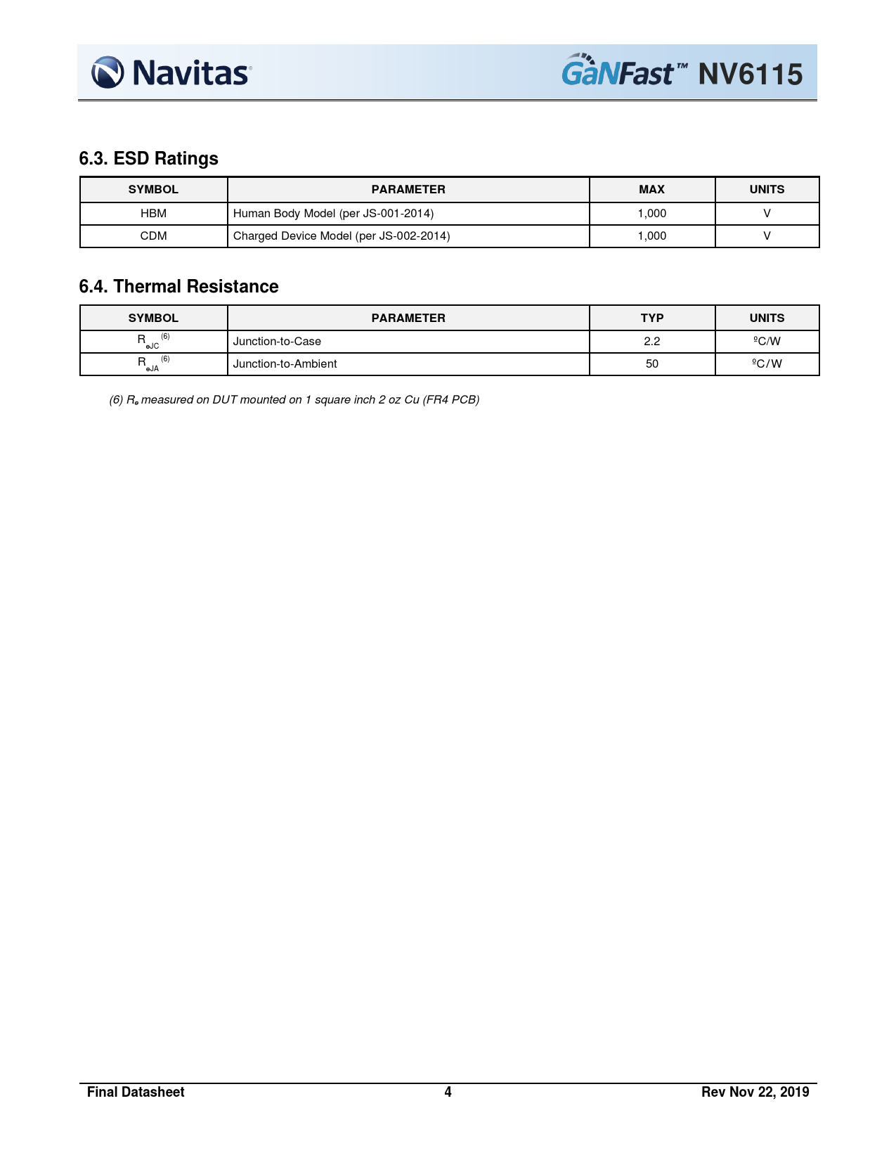 页数 / 页22 / 4 — NV6115. 6.3. ESD Ratings. SYMBOL. PARAMETER. MAX. UNITS. 6.4. Thermal …
