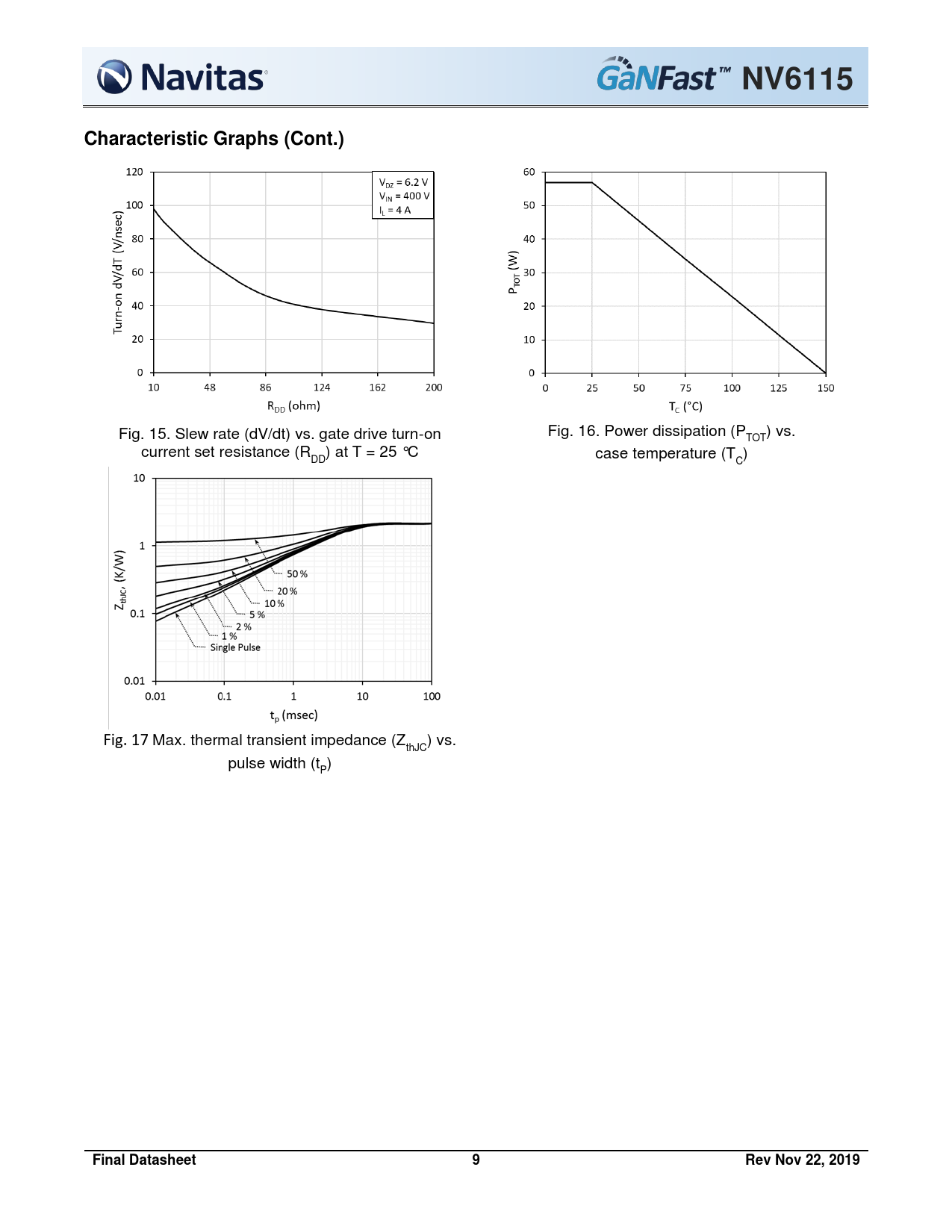 NV6115Characteristic Graphs (Cont.) Fig. 15. Slew rate (dV/dt) vs. gate drive turn-on Fig. 16. Power dissipation (P ) vs. TOT current set resistance (R ) at T = 25 °C case temperature (T ) DD C Fig. 17 Max. thermal transient impedance (Z ) vs. thJC pulse width (t ) P Final Datasheet9Rev Nov 22, 2019