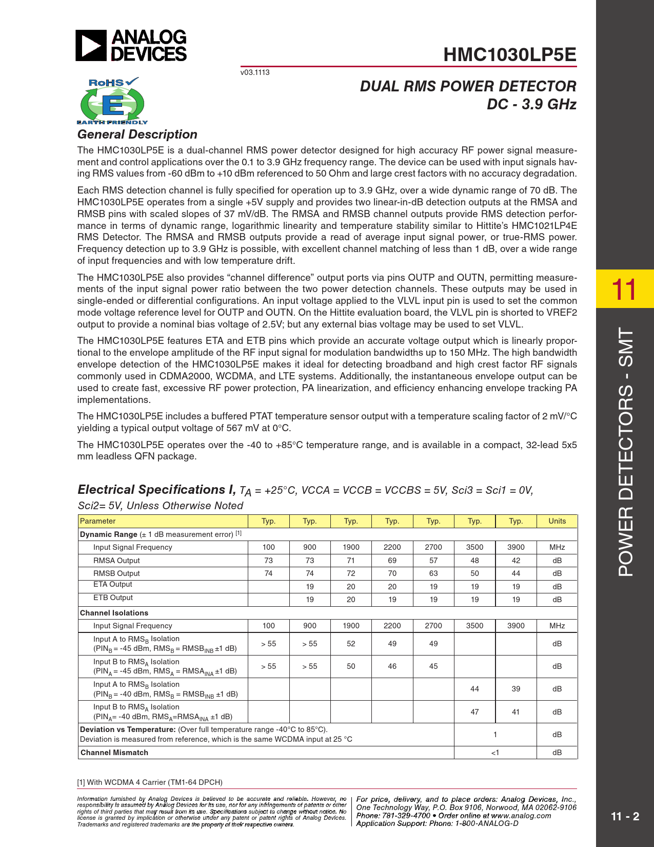 The HMC1030LP5E is a dual-channel RMS power detector designed for high accuracy RF power signal measure- ment and control applications over the 0.1 to 3.9 GHz frequency range. The device can be used with input signals hav- ing RMS values from -60 dBm to +10 dBm referenced to 50 Ohm and large crest factors with no accuracy degradation. Each RMS detection channel is ful y specified for operation up to 3.9 GHz, over a wide dynamic range of 70 dB. The HMC1030LP5E operates from a single +5V supply and provides two linear-in-dB detection outputs at the RMSA and RMSB pins with scaled slopes of 37 mV/dB. The RMSA and RMSB channel outputs provide RMS detection perfor- mance in terms of dynamic range, logarithmic linearity and temperature stability similar to Hittite’s HMC1021LP4E RMS Detector. The RMSA and RMSB outputs provide a read of average input signal power, or true-RMS power. Frequency detection up to 3.9 GHz is possible, with excel ent channel matching of less than 1 dB, over a wide range of input frequencies and with low temperature drift. The HMC1030LP5E also provides “channel difference” output ports via pins OUTP and OUTN, permitting measure- ments of the input signal power ratio between the two power detection channels. These outputs may be used in single-ended or differential configurations. An input voltage applied to the VLVL input pin is used to set the common 11 mode voltage reference level for OUTP and OUTN. On the Hittite evaluation board, the VLVL pin is shorted to VREF2 output to provide a nominal bias voltage of 2.5V; but any external bias voltage may be used to set VLVL. T The HMC1030LP5E features ETA and ETB pins which provide an accurate voltage output which is linearly propor- tional to the envelope amplitude of the RF input signal for modulation bandwidths up to 150 MHz. The high bandwidth M envelope detection of the HMC1030LP5E makes it ideal for detecting broadband and high crest factor RF signals S commonly used in CDMA2000, WCDMA, and LTE systems. Additional y, the instantaneous envelope output can be - used to create fast, excessive RF power protection, PA linearization, and efficiency enhancing envelope tracking PA implementations. RS The HMC1030LP5E includes a buffered PTAT temperature sensor output with a temperature scaling factor of 2 mV/°C O yielding a typical output voltage of 567 mV at 0°C. T The HMC1030LP5E operates over the -40 to +85°C temperature range, and is available in a compact, 32-lead 5x5 C mm leadless QFN package. TE E