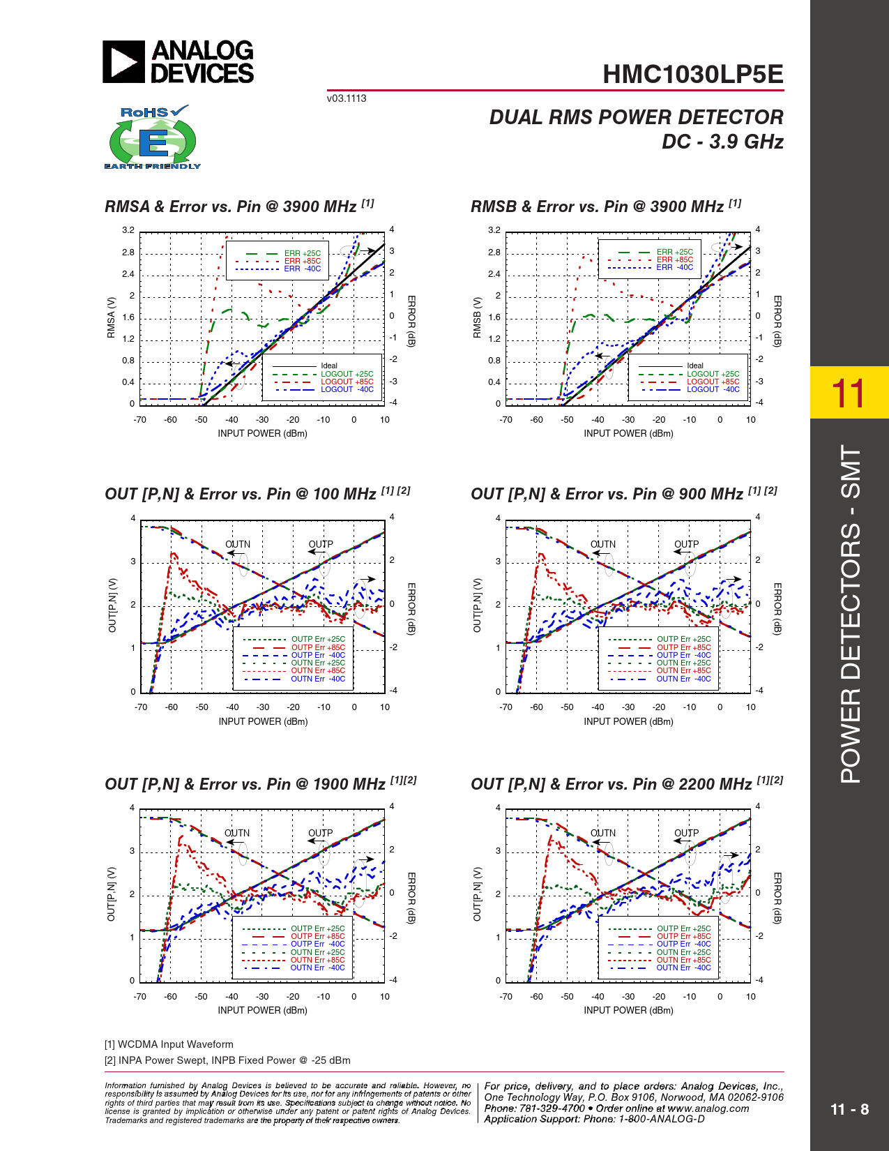 HMC1030LP5E DUAL RMS POWER DETECTOR DC - 3.9 GHz RMSA & Error vs Pin @ 3900 MHz [1]