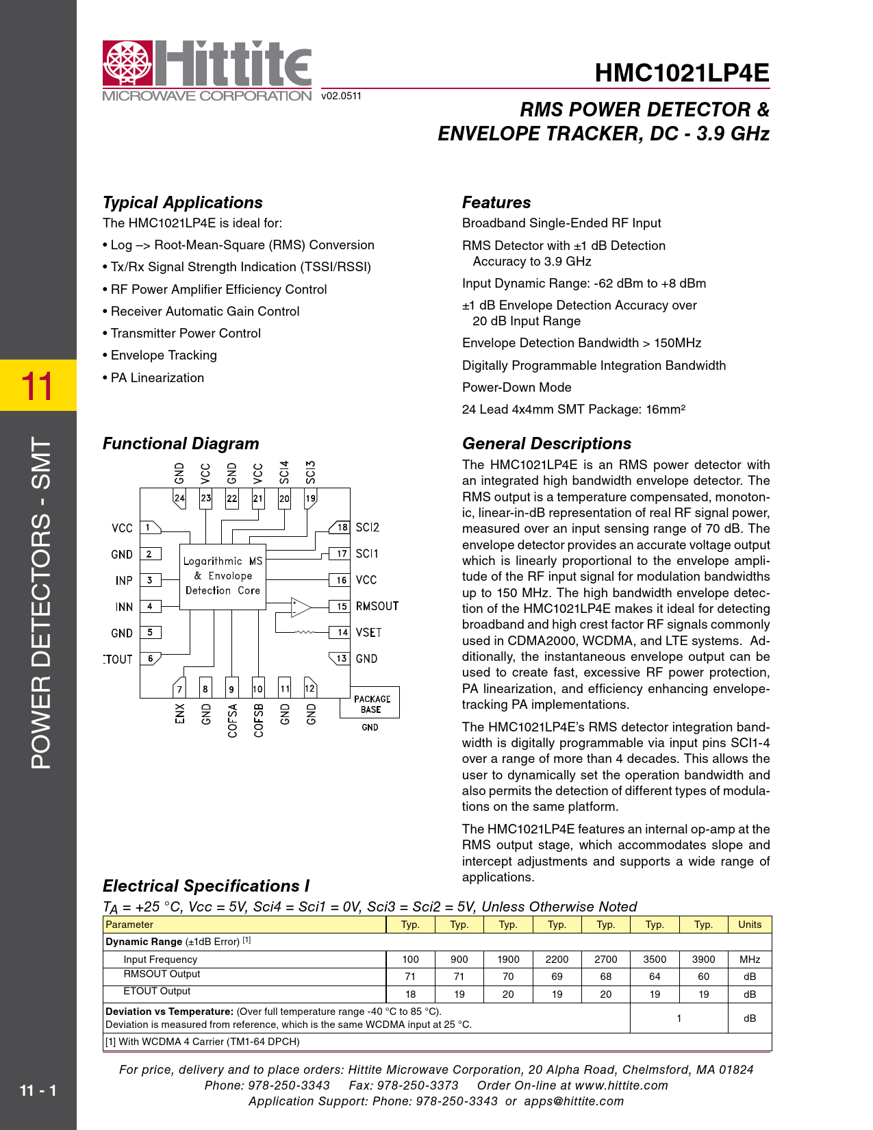 HMC1021LP4E v02.0511 RMS POWER DETECTOR &ENVELOPE TRACKER, DC - 3.9 GHzTypical ApplicationsFeatures the HMc1021LP4e is ideal for: Broadband single-ended rF Input • Log –> Root-Mean-Square (RMS) Conversion rMs Detector with ±1 dB Detection Accuracy to 3.9 GHz • Tx/Rx Signal Strength Indication (TSSI/RSSI) Input Dynamic range: -62 dBm to +8 dBm • RF Power Amplifier Efficiency Control ±1 dB envelope Detection Accuracy over • Receiver Automatic Gain Control 20 dB Input range • Transmitter Power Control envelope Detection Bandwidth > 150MHz • Envelope Tracking 11 Digital y Programmable Integration Bandwidth • PA Linearization Power-Down Mode 24 Lead 4x4mm sMt Package: 16mm² t Functional DiagramGeneral Descriptions M the HMc1021LP4e is an rMs power detector with s an integrated high bandwidth envelope detector. the - rMs output is a temperature compensated, monoton- ic, linear-in-dB representation of real rF signal power, rs measured over an input sensing range of 70 dB. the o envelope detector provides an accurate voltage output t which is linearly proportional to the envelope ampli- tude of the rF input signal for modulation bandwidths c up to 150 MHz. the high bandwidth envelope detec- e tion of the HMc1021LP4e makes it ideal for detecting t broadband and high crest factor rF signals commonly e used in cDMA2000, wcDMA, and Lte systems. Ad- D ditional y, the instantaneous envelope output can be r used to create fast, excessive rF power protection, e PA linearization, and efficiency enhancing envelope- tracking PA implementations. w the HMc1021LP4e’s rMs detector integration band- o width is digital y programmable via input pins scI1-4 P over a range of more than 4 decades. this al ows the user to dynamical y set the operation bandwidth and also permits the detection of different types of modula- tions on the same platform. the HMc1021LP4e features an internal op-amp at the rMs output stage, which accommodates slope and intercept adjustments and supports a wide range of applications. Electrical Specifications I TA = +25 °C, Vcc = 5V, Sci4 = Sci1 = 0V, Sci3 = Sci2 = 5V, Unless Otherwise Noted Parameter typ. typ. typ. typ. typ. typ. typ. Units Dynamic Range (±1dB Error) [1] Input Frequency 100 900 1900 2200 2700 3500 3900 MHz rMsoUt output 71 71 70 69 68 64 60 dB etoUt output 18 19 20 19 20 19 19 dB Deviation vs Temperature: (Over full temperature range -40 °C to 85 °C). 1 dB Deviation is measured from reference, which is the same WCDMA input at 25 °C. [1] With WCDMA 4 Carrier (TM1-64 DPCH) For price, delivery and to place orders: Hittite Microwave Corporation, 20 Alpha Road, Chelmsford, MA 01824 11 - 1 Phone: 978-250-3343 Fax: 978-250-3373 Order On-line at www.hittite.com Application Support: Phone: 978-250-3343 or apps@hittite.com Document Outline Typical Applications Features Functional Diagram General Descriptions Electrical Specifications I Electrical Specifications II RMSOUT vs. Pin with Different Modulations @ 1900 MHz RMSOUT Error vs. Pin with Different Modulations @ 1900 MHz Electrical Specifications III Typical Performance Characteristics RMSOUT & Error vs. Pin @ 100 MHz RMSOUT & Error vs. Pin @ 900 MHz RMSOUT & Error vs. Pin @ 1900 MHz RMSOUT & Error vs. Pin @ 2200 MHz RMSOUT & Error vs. Pin @ 2700 MHz RMSOUT & Error vs. Pin @ 3500 MHz RMSOUT & Error vs. Pin @ 3900 MHz RMSOUT Intercept vs. Frequency RMSOUT Slope vs. Frequency RMSOUT vs. Pin with WCDMA 4 Carrier @ +25 °C RMSOUT Error vs. Pin with WCDMA 4 Carrier @ +25 °C RMSOUT Error vs. Pin with WCDMA 4 Carrier @ +85 °C wrt +25 °C Response RMSOUT Error vs. Pin with WCDMA 4 Carrier @ -40 °C wrt +25 °C Response RMSOUT vs. Pin with CW @ +25 °C RMSOUT Error vs. Pin with CW @ +25 °C RMSOUT vs. Pin w/ CW & WCDMA 4 Carrier @ 1900 MHz & +25 °C Reading Error for WCDMA 4 Carrier wrt CW Response @ +25 °C RMSOUT vs. Pin w/ CW & WCDMA 4 Carrier @ 1900 MHz & +85 °C Reading Error for WCDMA 4 Carrier wrt CW Response @ +85 °C RMSOUT vs. Pin w/ CW & WCDMA 4 Carrier @ 1900 MHz & -40 °C Reading Error for WCDMA 4 Carrier wrt CW Response @ -40 °C RMSOUT Output Response with SCI = 0000 @ 1900 MHz RMSOUT Output Response with SCI = 1100 @ 1900 MHz Typical Supply Current vs. Pin, Vcc = 5V Input Return Loss vs. Frequency Output Ripple & Rise/Fall Time vs. Integration Setting [Sci4,Sci3,Sci2,Sci1] in Decimal ETOUT vs. Pin with CW @ 900 MHz ETOUT & ETOUT Error vs. Pin with CW @ 900 MHz ETOUT & ETOUT Error vs. Pin with CW @ 1900 MHz ETOUT vs. Pin with CW @ 3500 MHz ETOUT & ETOUT Error vs. Pin with CW @ 3500 MHz ETOUT Intercept vs. Frequency with CW ETOUT Slope vs. Frequency with CW Absolute Maximum Ratings Outline Drawing Package Information Pin Descriptions Evaluation PCB List of Materials Application Circuit Application Information Principle of Operation Configuration For The Typical Application Broadband Single-Ended Input Interface RMSOUT & Error vs. Pin Envelope Detector Output ETOUT Bandwidth ETOUT Response to an RF Input Signal with a 100 MHz Modulation Bandwidth RMS Output Interface and Transient Response Table 1: Transient Response vs. SCI Setting Rise Time vs. SCI Setting over Input Power Rise Settling Time vs. SCI Setting over Input Power Fall Time vs. SCI Setting over Input Power Residual Ripple for 900 MHz WiMAX @ SCI=0100 Residual Ripple for 900 MHz WiMAX @ SCI=0101 Residual Ripple for 900 MHz WiBRO @ SCI=0100 Residual Ripple for 900 MHz WiBRO@ SCI=0110 Residual Ripple for 900 MHz LTE Downlink @ SCI=0100 Residual Ripple for 900 MHz LTE Downlink @ SCI=0110 Residual Ripple for 900 MHz WCDMA4 @ SCI=0011 Residual Ripple for 900 MHz WCDMA4 @ SCI=0100 LOG-Slope and Intercept Slope Adjustment Intercept Adjustment DC Offset Compensation Loop Standby Mode Modulation Performance - Crest factor performance Reading Error for WCDMA 4 Carrier wrt CW Response @ +25 °C Reading Error for WCDMA 4 Carrier wrt CW Response @ 2200 MHz RMSOUT Error vs. Crest Factor over Frequency System Calibration Layout Considerations Definitions