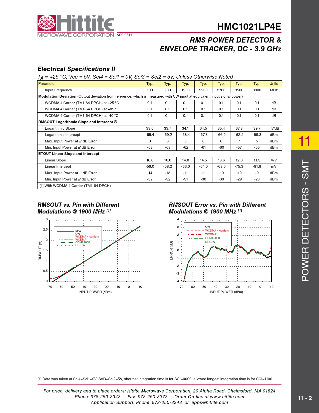 HMC1021LP4E v02.0511 RMS POWER DETECTOR &ENVELOPE TRACKER, DC - 3.9 GHzElectrical Specifications II TA = +25 °C, Vcc = 5V, Sci4 = Sci1 = 0V, Sci3 = Sci2 = 5V, Unless Otherwise Noted Parameter typ. typ. typ. typ. typ. typ. typ. Units Input Frequency 100 900 1900 2200 2700 3500 3900 MHz Modulation Deviation (Output deviation from reference, which is measured with CW input at equivalent input signal power) WCDMA 4 Carrier (TM1-64 DPCH) at +25 °C 0.1 0.1 0.1 0.1 0.1 0.1 0.1 dB WCDMA 4 Carrier (TM1-64 DPCH) at +85 °C 0.1 0.1 0.1 0.1 0.1 0.1 0.1 dB WCDMA 4 Carrier (TM1-64 DPCH) at -40 °C 0.1 0.1 0.1 0.1 0.1 0.1 0.1 dB RMSOUT Logarithmic Slope and Intercept [1] Logarithmic slope 33.6 33.7 34.1 34.5 35.4 37.8 39.7 mV/dB Logarithmic Intercept -69.4 -69.2 -68.4 -67.8 -66.2 -62.2 -59.3 dBm Max. Input Power at ±1dB error 8 8 8 8 8 7 5 dBm Min. Input Power at ±1dB error -63 -63 -62 -61 -60 -57 -55 dBm 11 ETOUT Linear Slope and Intercept Linear slope 16.6 16.0 14.8 14.5 13.6 12.3 11.3 V/V t Linear Intercept -56.0 -58.2 -63.0 -64.0 -68.0 -75.3 -81.8 mV Max. Input Power at ±1dB error -14 -13 -11 -11 -10 -10 -9 dBm M Min. Input Power at ±1dB error -32 -32 -31 -30 -30 -29 -28 dBm s [1] With WCDMA 4 Carrier (TM1-64 DPCH) - rs RMSOUT vs. Pin with DifferentRMSOUT Error vs. Pin with Different o Modulations @ 1900 MHz [1]Modulations @ 1900 MHz [1] t 3 4 c CW e 3 2.5 Ideal WCDMA 4 carriers t CW 2 WCDMA1 WCDMA 4 carriers CDMA2000 e 2 WCDMA1 CDMA2000 1 LTEDW LTEDW D 1.5 0 r RMSOUT (V) -1 1 ERROR (dB) e -2 w 0.5 -3 o 0 -4 P -70 -60 -50 -40 -30 -20 -10 0 10 -70 -60 -50 -40 -30 -20 -10 0 10 INPUT POWER (dBm) INPUT POWER (dBm) [1] Data was taken at sci4=sci1=0V, sci3=sci2=5V, shortest integration time is for scI=0000, allowed longest integration time is for scI=1100 For price, delivery and to place orders: Hittite Microwave Corporation, 20 Alpha Road, Chelmsford, MA 01824 Phone: 978-250-3343 Fax: 978-250-3373 Order On-line at www.hittite.com 11 - 2 Application Support: Phone: 978-250-3343 or apps@hittite.com Document Outline Typical Applications Features Functional Diagram General Descriptions Electrical Specifications I Electrical Specifications II RMSOUT vs. Pin with Different Modulations @ 1900 MHz RMSOUT Error vs. Pin with Different Modulations @ 1900 MHz Electrical Specifications III Typical Performance Characteristics RMSOUT & Error vs. Pin @ 100 MHz RMSOUT & Error vs. Pin @ 900 MHz RMSOUT & Error vs. Pin @ 1900 MHz RMSOUT & Error vs. Pin @ 2200 MHz RMSOUT & Error vs. Pin @ 2700 MHz RMSOUT & Error vs. Pin @ 3500 MHz RMSOUT & Error vs. Pin @ 3900 MHz RMSOUT Intercept vs. Frequency RMSOUT Slope vs. Frequency RMSOUT vs. Pin with WCDMA 4 Carrier @ +25 °C RMSOUT Error vs. Pin with WCDMA 4 Carrier @ +25 °C RMSOUT Error vs. Pin with WCDMA 4 Carrier @ +85 °C wrt +25 °C Response RMSOUT Error vs. Pin with WCDMA 4 Carrier @ -40 °C wrt +25 °C Response RMSOUT vs. Pin with CW @ +25 °C RMSOUT Error vs. Pin with CW @ +25 °C RMSOUT vs. Pin w/ CW & WCDMA 4 Carrier @ 1900 MHz & +25 °C Reading Error for WCDMA 4 Carrier wrt CW Response @ +25 °C RMSOUT vs. Pin w/ CW & WCDMA 4 Carrier @ 1900 MHz & +85 °C Reading Error for WCDMA 4 Carrier wrt CW Response @ +85 °C RMSOUT vs. Pin w/ CW & WCDMA 4 Carrier @ 1900 MHz & -40 °C Reading Error for WCDMA 4 Carrier wrt CW Response @ -40 °C RMSOUT Output Response with SCI = 0000 @ 1900 MHz RMSOUT Output Response with SCI = 1100 @ 1900 MHz Typical Supply Current vs. Pin, Vcc = 5V Input Return Loss vs. Frequency Output Ripple & Rise/Fall Time vs. Integration Setting [Sci4,Sci3,Sci2,Sci1] in Decimal ETOUT vs. Pin with CW @ 900 MHz ETOUT & ETOUT Error vs. Pin with CW @ 900 MHz ETOUT & ETOUT Error vs. Pin with CW @ 1900 MHz ETOUT vs. Pin with CW @ 3500 MHz ETOUT & ETOUT Error vs. Pin with CW @ 3500 MHz ETOUT Intercept vs. Frequency with CW ETOUT Slope vs. Frequency with CW Absolute Maximum Ratings Outline Drawing Package Information Pin Descriptions Evaluation PCB List of Materials Application Circuit Application Information Principle of Operation Configuration For The Typical Application Broadband Single-Ended Input Interface RMSOUT & Error vs. Pin Envelope Detector Output ETOUT Bandwidth ETOUT Response to an RF Input Signal with a 100 MHz Modulation Bandwidth RMS Output Interface and Transient Response Table 1: Transient Response vs. SCI Setting Rise Time vs. SCI Setting over Input Power Rise Settling Time vs. SCI Setting over Input Power Fall Time vs. SCI Setting over Input Power Residual Ripple for 900 MHz WiMAX @ SCI=0100 Residual Ripple for 900 MHz WiMAX @ SCI=0101 Residual Ripple for 900 MHz WiBRO @ SCI=0100 Residual Ripple for 900 MHz WiBRO@ SCI=0110 Residual Ripple for 900 MHz LTE Downlink @ SCI=0100 Residual Ripple for 900 MHz LTE Downlink @ SCI=0110 Residual Ripple for 900 MHz WCDMA4 @ SCI=0011 Residual Ripple for 900 MHz WCDMA4 @ SCI=0100 LOG-Slope and Intercept Slope Adjustment Intercept Adjustment DC Offset Compensation Loop Standby Mode Modulation Performance - Crest factor performance Reading Error for WCDMA 4 Carrier wrt CW Response @ +25 °C Reading Error for WCDMA 4 Carrier wrt CW Response @ 2200 MHz RMSOUT Error vs. Crest Factor over Frequency System Calibration Layout Considerations Definitions