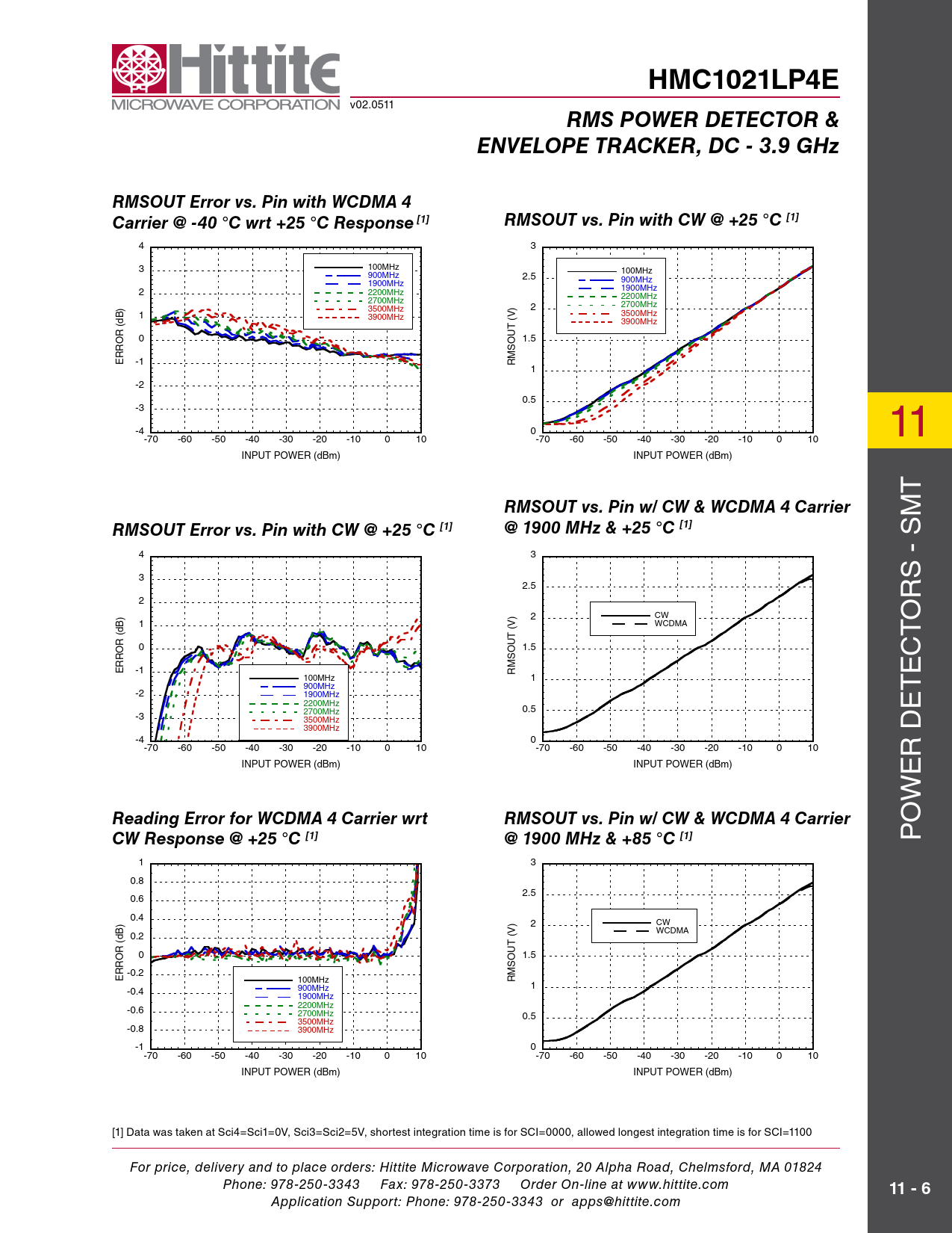 P 1 3 0.8 2.5 0.6 0.4 2 CW 0.2 WCDMA (V) (dB) 0 1.5 -0.2 ERROR 100MHz RMSOUT 1 -0.4 900MHz 1900MHz -0.6 2200MHz 2700MHz 0.5 3500MHz -0.8 3900MHz -1 0 -70 -60 -50 -40 -30 -20 -10 0 10 -70 -60 -50 -40 -30 -20 -10 0 10 INPUT POWER (dBm) INPUT POWER (dBm) [1] Data was taken at sci4=sci1=0V, sci3=sci2=5V, shortest integration time is for scI=0000, allowed longest integration time is for scI=1100 For price, delivery and to place orders: Hittite Microwave Corporation, 20 Alpha Road, Chelmsford, MA 01824 Phone: 978-250-3343 Fax: 978-250-3373 Order On-line at www.hittite.com
