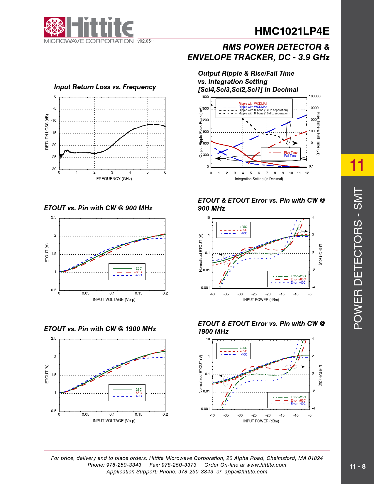 HMC1021LP4E v02.0511 RMS POWER DETECTOR &ENVELOPE TRACKER, DC - 3.9 GHzOutput Ripple & Rise/Fall Time vs. Integration SettingInput Return Loss vs. Frequency[Sci4,Sci3,Sci2,Sci1] in Decimal 0 1800 100000 Ripple with WCDMA1 -5 1500 Ripple with WCDMA4 10000 Ripple with 8 Tone (1kHz seperation) Rise Time & Fall Time (us) Ripple with 8 Tone (10kHz seperation) (dB) -10 1200 1000 LOSS -15 900 100 -20 600 10 RETURN Rise Time 1 -25 300 Fall Time Output Ripple Peak-Peak (mV) 0 0.1 -30 0 1 2 3 4 5 6 0 1 2 3 4 5 6 7 8 9 10 11 12 11 FREQUENCY (GHz) Integration Setting (in Decimal) t ETOUT & ETOUT Error vs. Pin with CW @ M ETOUT vs. Pin with CW @ 900 MHz900 MHz s 2.5 10 4 - +25C +85C 2 1 -40C 2 rs ERROR (dB) o t 1.5 0.1 0 c ETOUT (V) e +25C 1 -2 +85C Normalized ETOUT (V) 0.01 t -40C Error +25C Error +85C e Error -40C 0.001 -4 0.5 D 0 0.05 0.1 0.15 0.2 -40 -35 -30 -25 -20 -15 -10 -5 r INPUT VOLTAGE (Vp-p) INPUT POWER (dBm) e w o ETOUT & ETOUT Error vs. Pin with CW @ETOUT vs. Pin with CW @ 1900 MHz P 1900 MHz 2.5 10 4 +25C +85C 2 1 -40C 2 ERROR (dB) 1.5 0.1 0 ETOUT (V) +25C 1 -2 +85C Normalized ETOUT (V) 0.01 -40C Error +25C Error +85C Error -40C -4 0.5 0.001 0 0.05 0.1 0.15 0.2 -40 -35 -30 -25 -20 -15 -10 -5 INPUT VOLTAGE (Vp-p) INPUT POWER (dBm) For price, delivery and to place orders: Hittite Microwave Corporation, 20 Alpha Road, Chelmsford, MA 01824 Phone: 978-250-3343 Fax: 978-250-3373 Order On-line at www.hittite.com 11 - 8 Application Support: Phone: 978-250-3343 or apps@hittite.com Document Outline Typical Applications Features Functional Diagram General Descriptions Electrical Specifications I Electrical Specifications II RMSOUT vs. Pin with Different Modulations @ 1900 MHz RMSOUT Error vs. Pin with Different Modulations @ 1900 MHz Electrical Specifications III Typical Performance Characteristics RMSOUT & Error vs. Pin @ 100 MHz RMSOUT & Error vs. Pin @ 900 MHz RMSOUT & Error vs. Pin @ 1900 MHz RMSOUT & Error vs. Pin @ 2200 MHz RMSOUT & Error vs. Pin @ 2700 MHz RMSOUT & Error vs. Pin @ 3500 MHz RMSOUT & Error vs. Pin @ 3900 MHz RMSOUT Intercept vs. Frequency RMSOUT Slope vs. Frequency RMSOUT vs. Pin with WCDMA 4 Carrier @ +25 °C RMSOUT Error vs. Pin with WCDMA 4 Carrier @ +25 °C RMSOUT Error vs. Pin with WCDMA 4 Carrier @ +85 °C wrt +25 °C Response RMSOUT Error vs. Pin with WCDMA 4 Carrier @ -40 °C wrt +25 °C Response RMSOUT vs. Pin with CW @ +25 °C RMSOUT Error vs. Pin with CW @ +25 °C RMSOUT vs. Pin w/ CW & WCDMA 4 Carrier @ 1900 MHz & +25 °C Reading Error for WCDMA 4 Carrier wrt CW Response @ +25 °C RMSOUT vs. Pin w/ CW & WCDMA 4 Carrier @ 1900 MHz & +85 °C Reading Error for WCDMA 4 Carrier wrt CW Response @ +85 °C RMSOUT vs. Pin w/ CW & WCDMA 4 Carrier @ 1900 MHz & -40 °C Reading Error for WCDMA 4 Carrier wrt CW Response @ -40 °C RMSOUT Output Response with SCI = 0000 @ 1900 MHz RMSOUT Output Response with SCI = 1100 @ 1900 MHz Typical Supply Current vs. Pin, Vcc = 5V Input Return Loss vs. Frequency Output Ripple & Rise/Fall Time vs. Integration Setting [Sci4,Sci3,Sci2,Sci1] in Decimal ETOUT vs. Pin with CW @ 900 MHz ETOUT & ETOUT Error vs. Pin with CW @ 900 MHz ETOUT & ETOUT Error vs. Pin with CW @ 1900 MHz ETOUT vs. Pin with CW @ 3500 MHz ETOUT & ETOUT Error vs. Pin with CW @ 3500 MHz ETOUT Intercept vs. Frequency with CW ETOUT Slope vs. Frequency with CW Absolute Maximum Ratings Outline Drawing Package Information Pin Descriptions Evaluation PCB List of Materials Application Circuit Application Information Principle of Operation Configuration For The Typical Application Broadband Single-Ended Input Interface RMSOUT & Error vs. Pin Envelope Detector Output ETOUT Bandwidth ETOUT Response to an RF Input Signal with a 100 MHz Modulation Bandwidth RMS Output Interface and Transient Response Table 1: Transient Response vs. SCI Setting Rise Time vs. SCI Setting over Input Power Rise Settling Time vs. SCI Setting over Input Power Fall Time vs. SCI Setting over Input Power Residual Ripple for 900 MHz WiMAX @ SCI=0100 Residual Ripple for 900 MHz WiMAX @ SCI=0101 Residual Ripple for 900 MHz WiBRO @ SCI=0100 Residual Ripple for 900 MHz WiBRO@ SCI=0110 Residual Ripple for 900 MHz LTE Downlink @ SCI=0100 Residual Ripple for 900 MHz LTE Downlink @ SCI=0110 Residual Ripple for 900 MHz WCDMA4 @ SCI=0011 Residual Ripple for 900 MHz WCDMA4 @ SCI=0100 LOG-Slope and Intercept Slope Adjustment Intercept Adjustment DC Offset Compensation Loop Standby Mode Modulation Performance - Crest factor performance Reading Error for WCDMA 4 Carrier wrt CW Response @ +25 °C Reading Error for WCDMA 4 Carrier wrt CW Response @ 2200 MHz RMSOUT Error vs. Crest Factor over Frequency System Calibration Layout Considerations Definitions