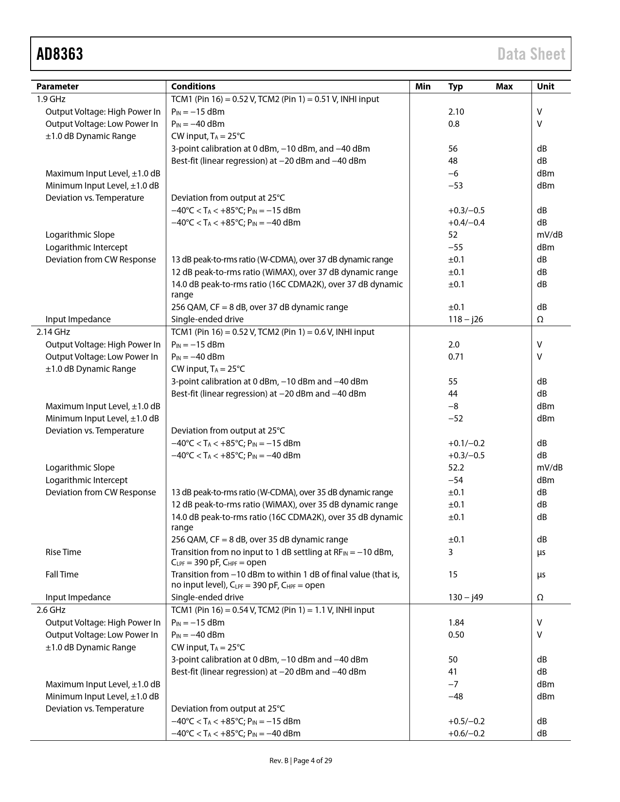 页数 / 页29 / 4 — AD8363. Data Sheet. Parameter. Conditions. Min. Typ. Max. Unit