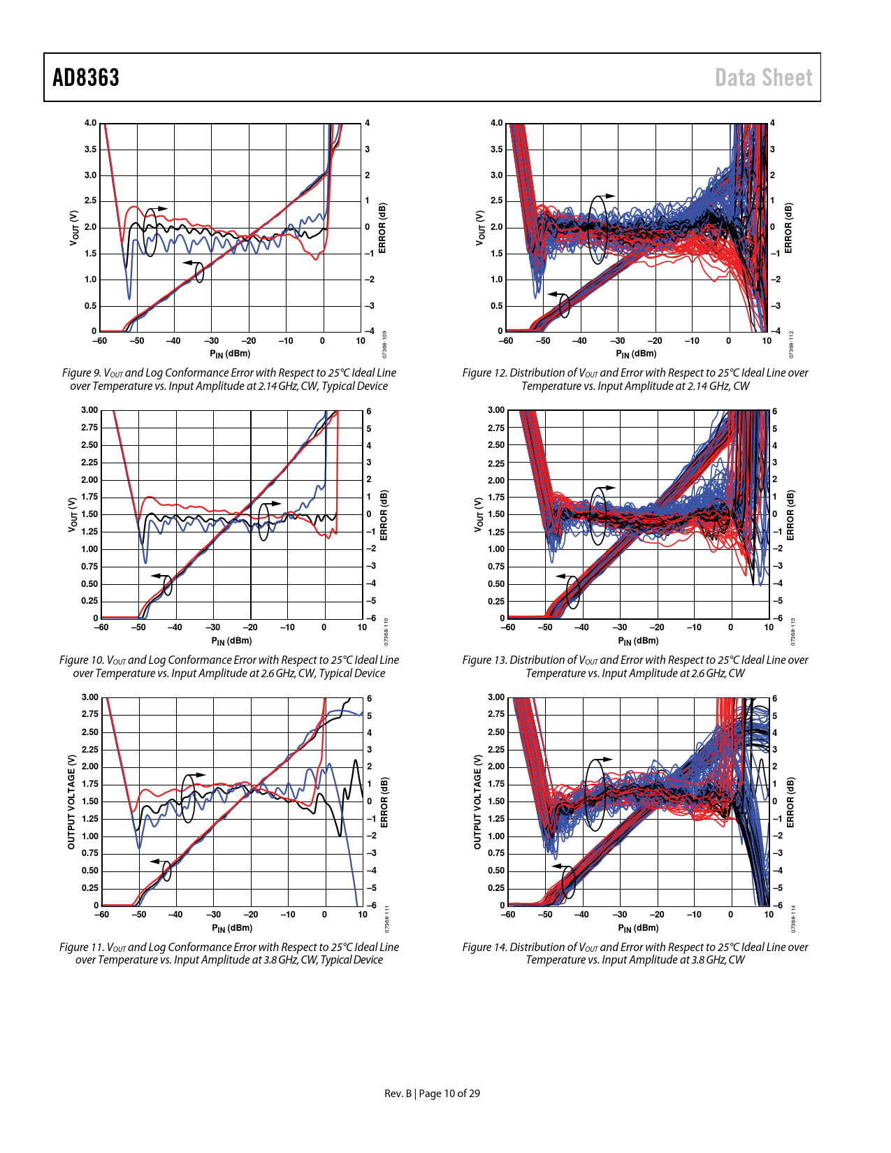 AD8363Data Sheet4.044.043.533.533.023.022.512.51B)B)dd(V)(V)2.00R (2.00R (UTUTOOVRROVRRO1.5–1E1.5–1E1.0–21.0–20.5–30.5–30–40–4–60–50–40–30–20–10010 109 –60–50–40–30–20–10010 112 PIN (dBm)P 07368- IN (dBm) 07368- Figure 9. VOUT and Log Conformance Error with Respect to 25°C Ideal Line Figure 12. Distribution of VOUT and Error with Respect to 25°C Ideal Line over over Temperature vs. Input Amplitude at 2.14 GHz, CW, Typical Device Temperature vs. Input Amplitude at 2.14 GHz, CW 3.0063.0062.7552.7552.5042.5042.2532.2532.0022.0021.751B)1B)d1.75d(V)(V)1.500R (1.500R (UTUTOOV 1.25–1RROV 1.25–1RROEE1.00–21.00–20.75–30.75–30.50–40.50–40.25–50.25–50–60–6–60–50–40–30–20–10010 110 –60–50–40–30–20–10010 113 PIN (dBm)P 07368- IN (dBm) 07368- Figure 10. VOUT and Log Conformance Error with Respect to 25°C Ideal Line Figure 13. Distribution of VOUT and Error with Respect to 25°C Ideal Line over over Temperature vs. Input Amplitude at 2.6 GHz, CW, Typical Device Temperature vs. Input Amplitude at 2.6 GHz, CW 3.0063.0062.7552.7552.5042.5042.2532.253))VV( 2.002( 2.002GEGE1.751B)1.751B)ddOLTA 1.500R (OLTA 1.500R (T V 1.25–1T VURRO1.25–1RROEUETP 1.00–2TP 1.00–2OUOU0.75–30.75–30.50–40.50–40.25–50.25–50–60–6–60–50–40–30–20–10010 111 –60–50–40–30–20–10010 114 PIN (dBm)P 07368- IN (dBm) 07368- Figure 11. VOUT and Log Conformance Error with Respect to 25°C Ideal Line Figure 14. Distribution of VOUT and Error with Respect to 25°C Ideal Line over over Temperature vs. Input Amplitude at 3.8 GHz, CW, Typical Device Temperature vs. Input Amplitude at 3.8 GHz, CW Rev. B | Page 10 of 29 Document Outline FEATURES APPLICATIONS FUNCTIONAL BLOCK DIAGRAM GENERAL DESCRIPTION TABLE OF CONTENTS REVISION HISTORY SPECIFICATIONS ABSOLUTE MAXIMUM RATINGS ESD CAUTION PIN CONFIGURATION AND FUNCTION DESCRIPTIONS TYPICAL PERFORMANCE CHARACTERISTICS THEORY OF OPERATION SQUARE LAW DETECTOR AND AMPLITUDE TARGET RF INPUT INTERFACE CHOICE OF RF INPUT PIN SMALL SIGNAL LOOP RESPONSE TEMPERATURE SENSOR INTERFACE VREF INTERFACE TEMPERATURE COMPENSATION INTERFACE POWER-DOWN INTERFACE VSET INTERFACE OUTPUT INTERFACE VTGT INTERFACE MEASUREMENT MODE BASIC CONNECTIONS SYSTEM CALIBRATION AND ERROR CALCULATION OPERATION TO 125°C OUTPUT VOLTAGE SCALING OFFSET COMPENSATION, MINIMUM CLPF, AND MAXIMUM CHPF CAPACITANCE VALUES CHOOSING A VALUE FOR CLPF RF PULSE RESPONSE AND VTGT CONTROLLER MODE BASIC CONNECTIONS CONSTANT OUTPUT POWER OPERATION DESCRIPTION OF RF CHARACTERIZATION EVALUATION AND CHARACTERIZATION CIRCUIT BOARD LAYOUTS ASSEMBLY DRAWINGS OUTLINE DIMENSIONS ORDERING GUIDE