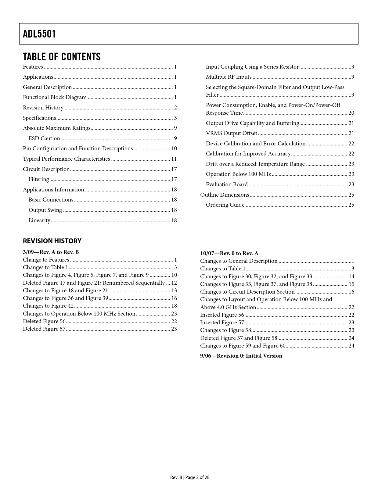 link to page 1 link to page 1 link to page 1 link to page 1 link to page 2 link to page 3 link to page 9 link to page 9 link to page 10 link to page 11 link to page 17 link to page 17 link to page 18 link to page 18 link to page 18 link to page 18 link to page 19 link to page 19 link to page 19 link to page 19 link to page 20 link to page 20 link to page 21 link to page 21 link to page 22 link to page 22 link to page 23 link to page 23 link to page 23 link to page 25 link to page 25 ADL5501TABLE OF CONTENTS Features .. 1 Input Coupling Using a Series Resistor ... 19 Applications ... 1 Multiple RF Inputs ... 19 General Description ... 1 Selecting the Square-Domain Filter and Output Low-Pass Functional Block Diagram .. 1 Filter ... 19 Revision History ... 2 Power Consumption, Enable, and Power-On/Power-Off Response Time .. 20 Specifications ... 3 Output Drive Capability and Buffering ... 21 Absolute Maximum Ratings .. 9 VRMS Output Offset ... 21 ESD Caution .. 9 Device Calibration and Error Calculation .. 22 Pin Configuration and Function Descriptions ... 10 Calibration for Improved Accuracy ... 22 Typical Performance Characteristics ... 11 Drift over a Reduced Temperature Range .. 23 Circuit Description ... 17 Operation Below 100 MHz ... 23 Filtering .. 17 Evaluation Board .. 23 Applications Information .. 18 Outline Dimensions ... 25 Basic Connections .. 18 Ordering Guide .. 25 Output Swing .. 18 Linearity ... 18 REVISION HISTORY3/09—Rev. A to Rev. B10/07—Rev. 0 to Rev. A Change to Features ... 1 Changes to General Description ... 1 Changes to Table 1 .. 3 Changes to Table 1 ... 3 Changes to Figure 4, Figure 5, Figure 7, and Figure 9 ... 10 Changes to Figure 30, Figure 32, and Figure 33 ... 14 Deleted Figure 17 and Figure 21; Renumbered Sequentially ... 12 Changes to Figure 35, Figure 37, and Figure 38 ... 15 Changes to Figure 18 and Figure 21 ... 13 Changes to Circuit Description Section .. 16 Changes to Figure 36 and Figure 39 ... 16 Changes to Layout and Operation Below 100 MHz and Changes to Figure 42 .. 18 Above 4.0 GHz Section .. 22 Changes to Operation Below 100 MHz Section ... 23 Inserted Figure 56 ... 22 Deleted Figure 56 .. 22 Inserted Figure 57 ... 23 Deleted Figure 57 .. 23 Changes to Figure 58 .. 23 Deleted Figure 57 and Figure 58 .. 24 Changes to Figure 59 and Figure 60... 24 9/06—Revision 0: Initial Version Rev. B | Page 2 of 28 Document Outline FEATURES APPLICATIONS GENERAL DESCRIPTION FUNCTIONAL BLOCK DIAGRAM TABLE OF CONTENTS REVISION HISTORY SPECIFICATIONS ABSOLUTE MAXIMUM RATINGS ESD CAUTION PIN CONFIGURATION AND FUNCTION DESCRIPTIONS TYPICAL PERFORMANCE CHARACTERISTICS CIRCUIT DESCRIPTION FILTERING APPLICATIONS INFORMATION BASIC CONNECTIONS OUTPUT SWING LINEARITY INPUT COUPLING USING A SERIES RESISTOR MULTIPLE RF INPUTS SELECTING THE SQUARE-DOMAIN FILTER AND OUTPUT LOW-PASS FILTER POWER CONSUMPTION, ENABLE, AND POWER-ON/POWER-OFF RESPONSE TIME OUTPUT DRIVE CAPABILITY AND BUFFERING VRMS OUTPUT OFFSET DEVICE CALIBRATION AND ERROR CALCULATION CALIBRATION FOR IMPROVED ACCURACY DRIFT OVER A REDUCED TEMPERATURE RANGE OPERATION BELOW 100 MHz EVALUATION BOARD OUTLINE DIMENSIONS ORDERING GUIDE