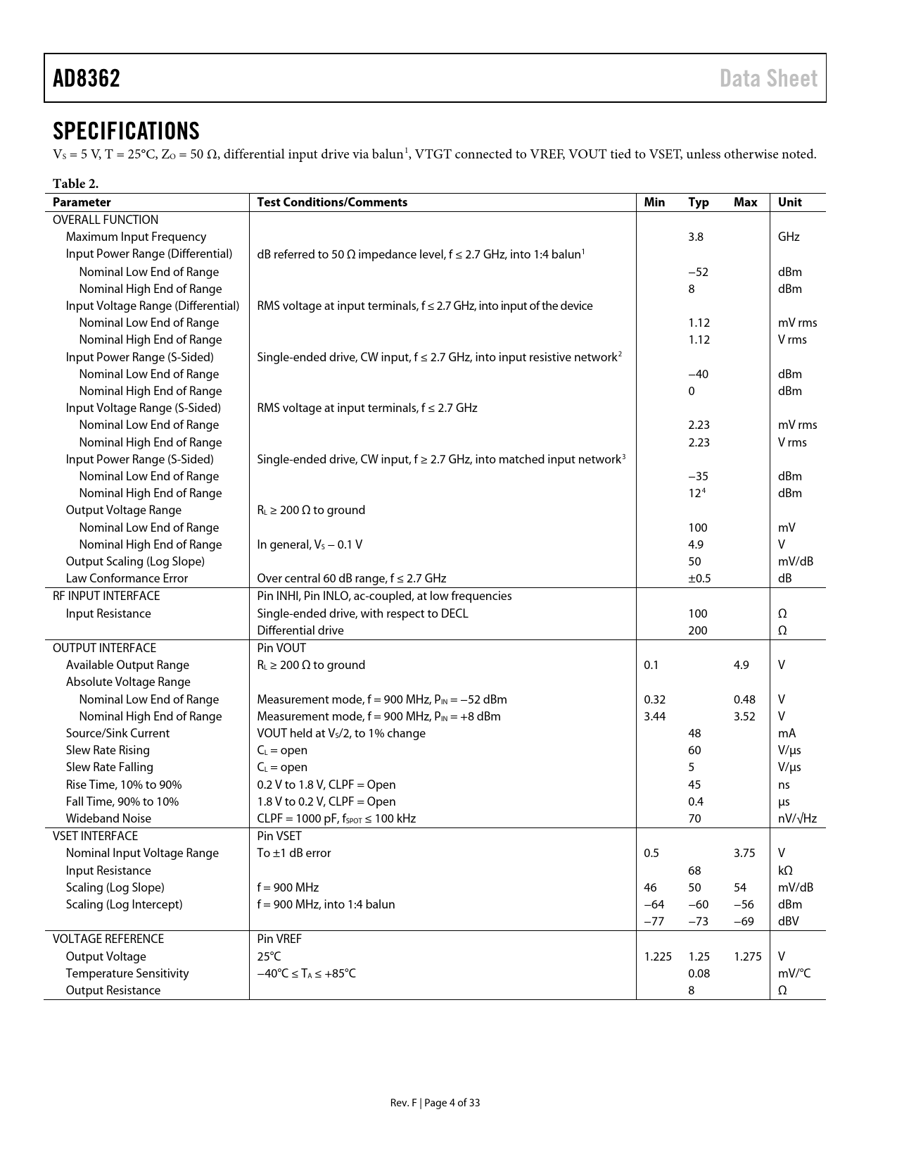 link to page 6 link to page 6 link to page 6 link to page 6 link to page 6 AD8362Data SheetSPECIFICATIONS VS = 5 V, T = 25°C, ZO = 50 Ω, differential input drive via balun1, VTGT connected to VREF, VOUT tied to VSET, unless otherwise noted. Table 2. ParameterTest Conditions/CommentsMinTypMaxUnit OVERALL FUNCTION Maximum Input Frequency 3.8 GHz Input Power Range (Differential) dB referred to 50 Ω impedance level, f ≤ 2.7 GHz, into 1:4 balun1 Nominal Low End of Range −52 dBm Nominal High End of Range 8 dBm Input Voltage Range (Differential) RMS voltage at input terminals, f ≤ 2.7 GHz, into input of the device Nominal Low End of Range 1.12 mV rms Nominal High End of Range 1.12 V rms Input Power Range (S-Sided) Single-ended drive, CW input, f ≤ 2.7 GHz, into input resistive network2 Nominal Low End of Range −40 dBm Nominal High End of Range 0 dBm Input Voltage Range (S-Sided) RMS voltage at input terminals, f ≤ 2.7 GHz Nominal Low End of Range 2.23 mV rms Nominal High End of Range 2.23 V rms Input Power Range (S-Sided) Single-ended drive, CW input, f ≥ 2.7 GHz, into matched input network3 Nominal Low End of Range −35 dBm Nominal High End of Range 124 dBm Output Voltage Range RL ≥ 200 Ω to ground Nominal Low End of Range 100 mV Nominal High End of Range In general, VS − 0.1 V 4.9 V Output Scaling (Log Slope) 50 mV/dB Law Conformance Error Over central 60 dB range, f ≤ 2.7 GHz ±0.5 dB RF INPUT INTERFACE Pin INHI, Pin INLO, ac-coupled, at low frequencies Input Resistance Single-ended drive, with respect to DECL 100 Ω Differential drive 200 Ω OUTPUT INTERFACE Pin VOUT Available Output Range RL ≥ 200 Ω to ground 0.1 4.9 V Absolute Voltage Range Nominal Low End of Range Measurement mode, f = 900 MHz, PIN = −52 dBm 0.32 0.48 V Nominal High End of Range Measurement mode, f = 900 MHz, PIN = +8 dBm 3.44 3.52 V Source/Sink Current VOUT held at VS/2, to 1% change 48 mA Slew Rate Rising CL = open 60 V/µs Slew Rate Falling CL = open 5 V/µs Rise Time, 10% to 90% 0.2 V to 1.8 V, CLPF = Open 45 ns Fall Time, 90% to 10% 1.8 V to 0.2 V, CLPF = Open 0.4 µs Wideband Noise CLPF = 1000 pF, fSPOT ≤ 100 kHz 70 nV/√Hz VSET INTERFACE Pin VSET Nominal Input Voltage Range To ±1 dB error 0.5 3.75 V Input Resistance 68 kΩ Scaling (Log Slope) f = 900 MHz 46 50 54 mV/dB Scaling (Log Intercept) f = 900 MHz, into 1:4 balun −64 −60 −56 dBm −77 −73 −69 dBV VOLTAGE REFERENCE Pin VREF Output Voltage 25°C 1.225 1.25 1.275 V Temperature Sensitivity −40°C ≤ TA ≤ +85°C 0.08 mV/°C Output Resistance 8 Ω Rev. F | Page 4 of 33 Document Outline FEATURES APPLICATIONS FUNCTIONAL BLOCK DIAGRAM GENERAL DESCRIPTION TABLE OF CONTENTS REVISION HISTORY SPECIFICATIONS ABSOLUTE MAXIMUM RATINGS ESD CAUTION PIN CONFIGURATION AND FUNCTION DESCRIPTIONS EQUIVALENT CIRCUITS TYPICAL PERFORMANCE CHARACTERISTICS CHARACTERIZATION SETUP EQUIPMENT ANALYSIS CIRCUIT DESCRIPTION SQUARE LAW DETECTION VOLTAGE vs. POWER CALIBRATION OFFSET ELIMINATION TIME-DOMAIN RESPONSE OF THE CLOSED LOOP OPERATION IN RF MEASUREMENT MODE BASIC CONNECTIONS DEVICE DISABLE RECOMMENDED INPUT COUPLING Choosing Input Coupling Capacitors Single-Ended Input Drive OPERATION AT LOW FREQUENCIES CHOOSING A VALUE FOR CHPF CHOOSING A VALUE FOR CLPF ADJUSTING VTGT TO ACCOMMODATE SIGNALS WITH VERY HIGH CREST FACTORS ALTERING THE SLOPE TEMPERATURE COMPENSATION AND REDUCTION OF TRANSFER FUNCTION RIPPLE TEMPERATURE COMPENSATION AT VARIOUS WiMAX FREQUENCIES UP TO 3.8 GHz OPERATION IN CONTROLLER MODE RMS VOLTMETER WITH 90 dB DYNAMIC RANGE AD8362 EVALUATION BOARD OUTLINE DIMENSIONS ORDERING GUIDE