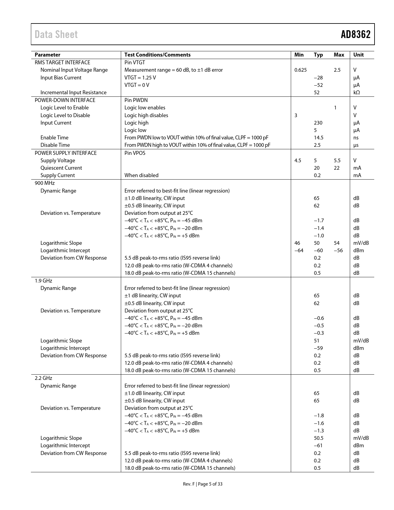 Data SheetAD8362Parameter TestConditions/CommentsMinTypMaxUnit RMS TARGET INTERFACE Pin VTGT Nominal Input Voltage Range Measurement range = 60 dB, to ±1 dB error 0.625 2.5 V Input Bias Current VTGT = 1.25 V −28 μA VTGT = 0 V −52 μA Incremental Input Resistance 52 kΩ POWER-DOWN INTERFACE Pin PWDN Logic Level to Enable Logic low enables 1 V Logic Level to Disable Logic high disables 3 V Input Current Logic high 230 μA Logic low 5 μA Enable Time From PWDN low to VOUT within 10% of final value, CLPF = 1000 pF 14.5 ns Disable Time From PWDN high to VOUT within 10% of final value, CLPF = 1000 pF 2.5 μs POWER SUPPLY INTERFACE Pin VPOS Supply Voltage 4.5 5 5.5 V Quiescent Current 20 22 mA Supply Current When disabled 0.2 mA 900 MHz Dynamic Range Error referred to best-fit line (linear regression) ±1.0 dB linearity, CW input 65 dB ±0.5 dB linearity, CW input 62 dB Deviation vs. Temperature Deviation from output at 25°C −40°C < TA < +85°C, PIN = −45 dBm −1.7 dB −40°C < TA < +85°C, PIN = −20 dBm −1.4 dB −40°C < TA < +85°C, PIN = +5 dBm −1.0 dB Logarithmic Slope 46 50 54 mV/dB Logarithmic Intercept −64 −60 −56 dBm Deviation from CW Response 5.5 dB peak-to-rms ratio (IS95 reverse link) 0.2 dB 12.0 dB peak-to-rms ratio (W-CDMA 4 channels) 0.2 dB 18.0 dB peak-to-rms ratio (W-CDMA 15 channels) 0.5 dB 1.9 GHz Dynamic Range Error referred to best-fit line (linear regression) ±1 dB linearity, CW input 65 dB ±0.5 dB linearity, CW input 62 dB Deviation vs. Temperature Deviation from output at 25°C −40°C < TA < +85°C, PIN = −45 dBm −0.6 dB −40°C < TA < +85°C, PIN = −20 dBm −0.5 dB −40°C < TA < +85°C, PIN = +5 dBm −0.3 dB Logarithmic Slope 51 mV/dB Logarithmic Intercept −59 dBm Deviation from CW Response 5.5 dB peak-to-rms ratio (IS95 reverse link) 0.2 dB 12.0 dB peak-to-rms ratio (W-CDMA 4 channels) 0.2 dB 18.0 dB peak-to-rms ratio (W-CDMA 15 channels) 0.5 dB 2.2 GHz Dynamic Range Error referred to best-fit line (linear regression) ±1.0 dB linearity, CW input 65 dB ±0.5 dB linearity, CW input 65 dB Deviation vs. Temperature Deviation from output at 25°C −40°C < TA < +85°C, PIN = −45 dBm −1.8 dB −40°C < TA < +85°C, PIN = −20 dBm −1.6 dB −40°C < TA < +85°C, PIN = +5 dBm −1.3 dB Logarithmic Slope 50.5 mV/dB Logarithmic Intercept −61 dBm Deviation from CW Response 5.5 dB peak-to-rms ratio (IS95 reverse link) 0.2 dB 12.0 dB peak-to-rms ratio (W-CDMA 4 channels) 0.2 dB 18.0 dB peak-to-rms ratio (W-CDMA 15 channels) 0.5 dB Rev. F | Page 5 of 33 Document Outline FEATURES APPLICATIONS FUNCTIONAL BLOCK DIAGRAM GENERAL DESCRIPTION TABLE OF CONTENTS REVISION HISTORY SPECIFICATIONS ABSOLUTE MAXIMUM RATINGS ESD CAUTION PIN CONFIGURATION AND FUNCTION DESCRIPTIONS EQUIVALENT CIRCUITS TYPICAL PERFORMANCE CHARACTERISTICS CHARACTERIZATION SETUP EQUIPMENT ANALYSIS CIRCUIT DESCRIPTION SQUARE LAW DETECTION VOLTAGE vs. POWER CALIBRATION OFFSET ELIMINATION TIME-DOMAIN RESPONSE OF THE CLOSED LOOP OPERATION IN RF MEASUREMENT MODE BASIC CONNECTIONS DEVICE DISABLE RECOMMENDED INPUT COUPLING Choosing Input Coupling Capacitors Single-Ended Input Drive OPERATION AT LOW FREQUENCIES CHOOSING A VALUE FOR CHPF CHOOSING A VALUE FOR CLPF ADJUSTING VTGT TO ACCOMMODATE SIGNALS WITH VERY HIGH CREST FACTORS ALTERING THE SLOPE TEMPERATURE COMPENSATION AND REDUCTION OF TRANSFER FUNCTION RIPPLE TEMPERATURE COMPENSATION AT VARIOUS WiMAX FREQUENCIES UP TO 3.8 GHz OPERATION IN CONTROLLER MODE RMS VOLTMETER WITH 90 dB DYNAMIC RANGE AD8362 EVALUATION BOARD OUTLINE DIMENSIONS ORDERING GUIDE