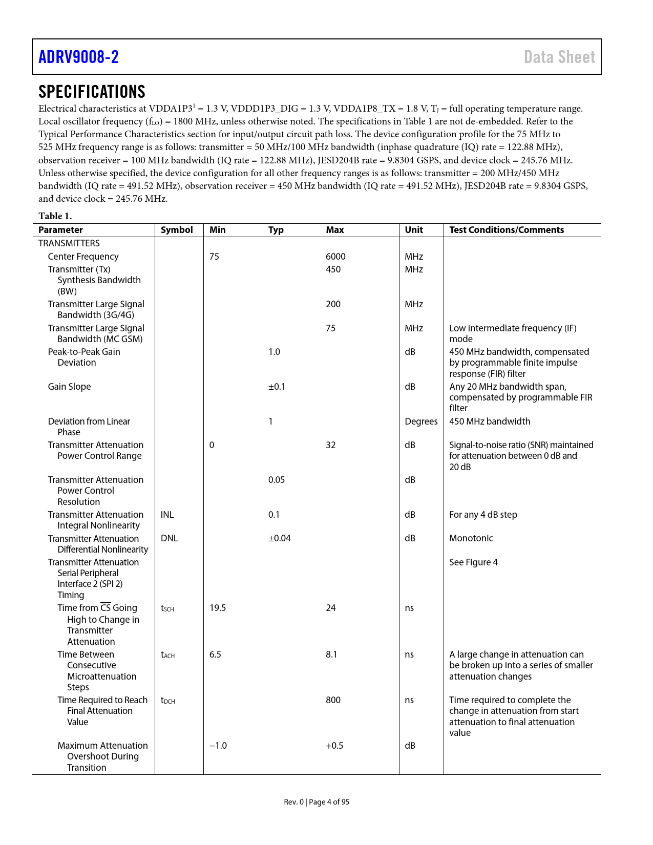 页数 / 页95 / 4 — ADRV9008-2. Data Sheet. SPECIFICATIONS. Table 1. Parameter. Symbol. Min. …