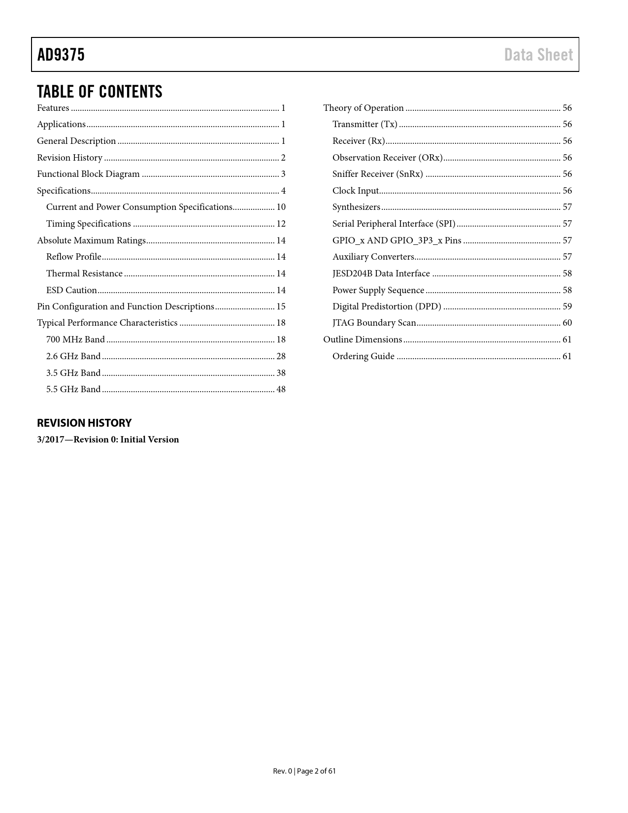 link to page 1 link to page 1 link to page 1 link to page 2 link to page 3 link to page 4 link to page 10 link to page 12 link to page 14 link to page 14 link to page 14 link to page 14 link to page 15 link to page 18 link to page 18 link to page 28 link to page 38 link to page 48 link to page 56 link to page 56 link to page 56 link to page 56 link to page 56 link to page 56 link to page 57 link to page 57 link to page 57 link to page 57 link to page 58 link to page 58 link to page 59 link to page 60 link to page 61 link to page 61 AD9375Data SheetTABLE OF CONTENTS Features .. 1 Theory of Operation .. 56 Applications ... 1 Transmitter (Tx) ... 56 General Description ... 1 Receiver (Rx) ... 56 Revision History ... 2 Observation Receiver (ORx) ... 56 Functional Block Diagram .. 3 Sniffer Receiver (SnRx) ... 56 Specifications ... 4 Clock Input.. 56 Current and Power Consumption Specifications... 10 Synthesizers ... 57 Timing Specifications .. 12 Serial Peripheral Interface (SPI) ... 57 Absolute Maximum Ratings .. 14 GPIO_x AND GPIO_3P3_x Pins .. 57 Reflow Profile .. 14 Auxiliary Converters .. 57 Thermal Resistance .. 14 JESD204B Data Interface .. 58 ESD Caution .. 14 Power Supply Sequence ... 58 Pin Configuration and Function Descriptions ... 15 Digital Predistortion (DPD) ... 59 Typical Performance Characteristics ... 18 JTAG Boundary Scan ... 60 700 MHz Band .. 18 Outline Dimensions ... 61 2.6 GHz Band .. 28 Ordering Guide .. 61 3.5 GHz Band .. 38 5.5 GHz Band .. 48 REVISION HISTORY 3/2017—Revision 0: Initial Version Rev. 0 | Page 2 of 61 Document Outline Features Applications General Description Revision History Functional Block Diagram Specifications Current and Power Consumption Specifications Timing Specifications Timing Diagrams Absolute Maximum Ratings Reflow Profile Thermal Resistance ESD Caution Pin Configuration and Function Descriptions Typical Performance Characteristics 700 MHz Band 2.6 GHz Band 3.5 GHz Band 5.5 GHz Band Theory of Operation Transmitter (Tx) Receiver (Rx) Observation Receiver (ORx) Sniffer Receiver (SnRx) Clock Input Synthesizers RF PLL Clock PLL Serial Peripheral Interface (SPI) GPIO_x AND GPIO_3P3_x Pins Auxiliary Converters Auxiliary ADC Inputs (AUXADC_x) Auxiliary DACs (AUXDAC_x) JESD204B Data Interface Power Supply Sequence Digital Predistortion (DPD) JTAG Boundary Scan Outline Dimensions Ordering Guide