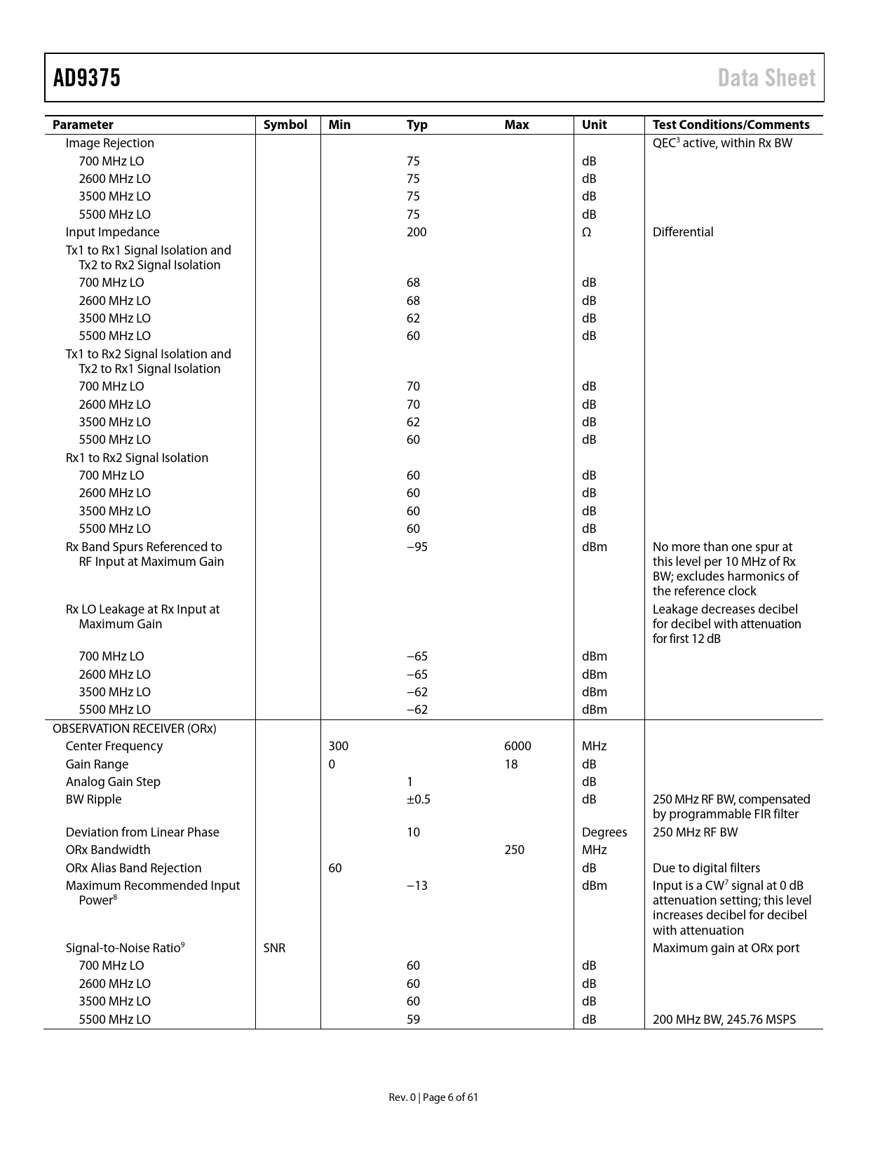 AD9375 Data Sheet Parameter Symbol Min Typ Max Unit Test Conditions/Comments