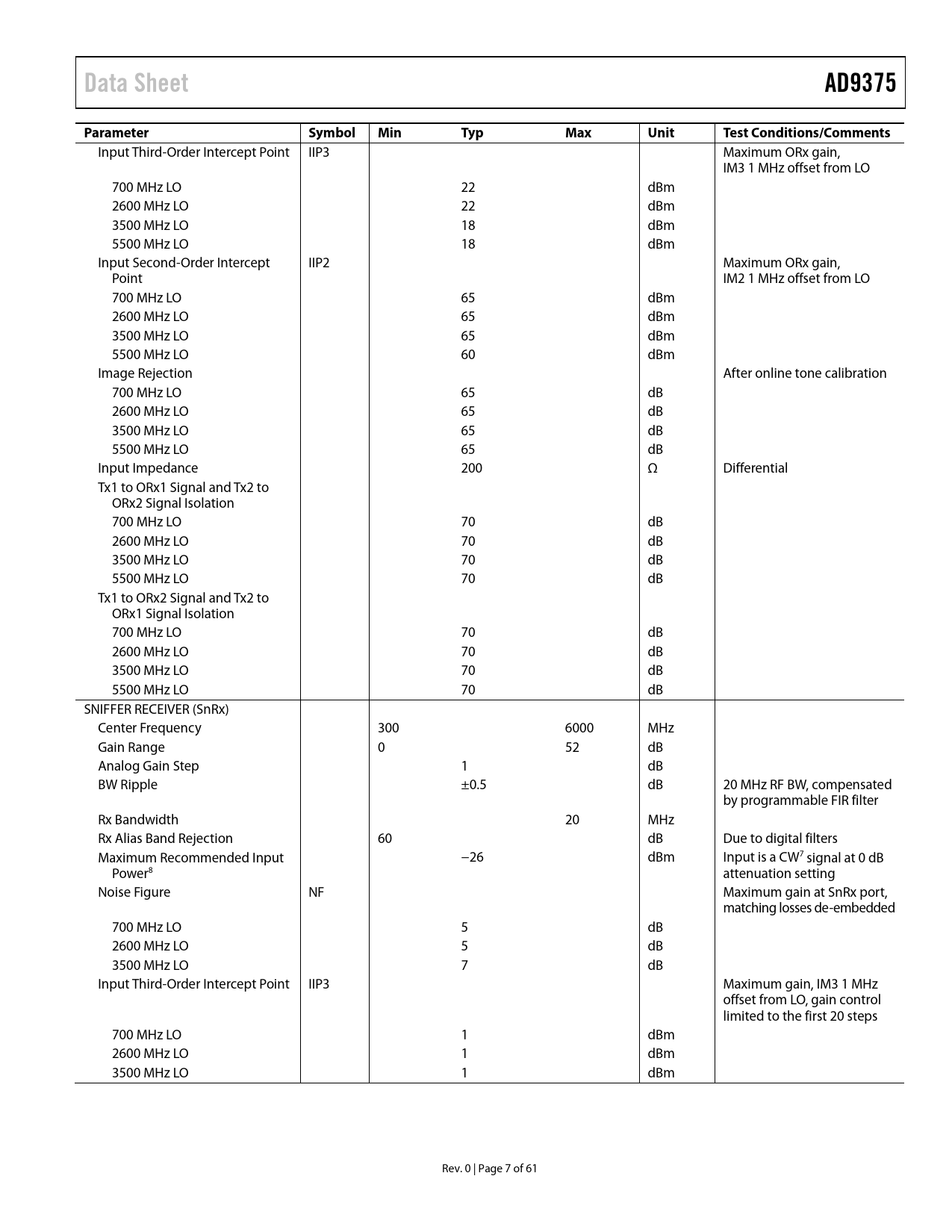 Input Third-Order Intercept Point IIP3 Maximum ORx gain, IM3 1 MHz offset from LO 700 MHz LO 22 dBm 2600 MHz LO 22 dBm 3500 MHz LO 18 dBm 5500 MHz LO 18 dBm Input Second-Order Intercept IIP2 Maximum ORx gain, Point IM2 1 MHz offset from LO 700 MHz LO 65 dBm 2600 MHz LO 65 dBm 3500 MHz LO 65 dBm 5500 MHz LO 60 dBm Image Rejection After online tone calibration 700 MHz LO 65 dB 2600 MHz LO 65 dB 3500 MHz LO 65 dB 5500 MHz LO 65 dB Input Impedance 200 Ω Differential Tx1 to ORx1 Signal and Tx2 to ORx2 Signal Isolation 700 MHz LO 70 dB 2600 MHz LO 70 dB 3500 MHz LO 70 dB 5500 MHz LO 70 dB Tx1 to ORx2 Signal and Tx2 to ORx1 Signal Isolation 700 MHz LO 70 dB 2600 MHz LO 70 dB 3500 MHz LO 70 dB 5500 MHz LO 70 dB SNIFFER RECEIVER (SnRx) Center Frequency 300 6000 MHz Gain Range 0 52 dB Analog Gain Step 1 dB BW Ripple ±0.5 dB 20 MHz RF BW, compensated by programmable FIR filter Rx Bandwidth 20 MHz Rx Alias Band Rejection 60 dB Due to digital filters Maximum Recommended Input −26 dBm Input is a CW7 signal at 0 dB Power8 attenuation setting Noise Figure NF Maximum gain at SnRx port, matching losses de-embedded 700 MHz LO 5 dB 2600 MHz LO 5 dB 3500 MHz LO 7 dB Input Third-Order Intercept Point IIP3 Maximum gain, IM3 1 MHz offset from LO, gain control limited to the first 20 steps 700 MHz LO 1 dBm 2600 MHz LO 1 dBm 3500 MHz LO 1 dBm Rev. 0 | Page 7 of 61 Document Outline Features Applications General Description Revision History Functional Block Diagram Specifications Current and Power Consumption Specifications Timing Specifications Timing Diagrams Absolute Maximum Ratings Reflow Profile Thermal Resistance ESD Caution Pin Configuration and Function Descriptions Typical Performance Characteristics 700 MHz Band 2.6 GHz Band 3.5 GHz Band 5.5 GHz Band Theory of Operation Transmitter (Tx) Receiver (Rx) Observation Receiver (ORx) Sniffer Receiver (SnRx) Clock Input Synthesizers RF PLL Clock PLL Serial Peripheral Interface (SPI) GPIO_x AND GPIO_3P3_x Pins Auxiliary Converters Auxiliary ADC Inputs (AUXADC_x) Auxiliary DACs (AUXDAC_x) JESD204B Data Interface Power Supply Sequence Digital Predistortion (DPD) JTAG Boundary Scan Outline Dimensions Ordering Guide