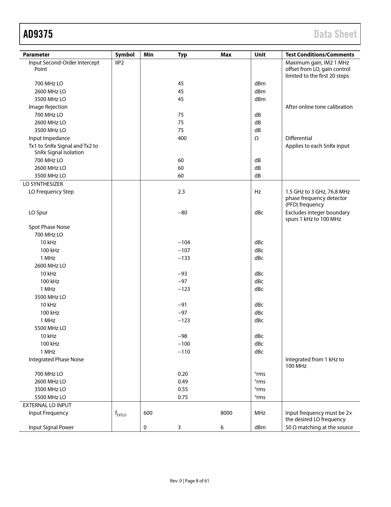 Input Second-Order Intercept IIP2 Maximum gain, IM2 1 MHz Point offset from LO, gain control limited to the first 20 steps 700 MHz LO 45 dBm 2600 MHz LO 45 dBm 3500 MHz LO 45 dBm Image Rejection After online tone calibration 700 MHz LO 75 dB 2600 MHz LO 75 dB 3500 MHz LO 75 dB Input Impedance 400 Ω Differential Tx1 to SnRx Signal and Tx2 to Applies to each SnRx input SnRx Signal Isolation 700 MHz LO 60 dB 2600 MHz LO 60 dB 3500 MHz LO 60 dB LO SYNTHESIZER LO Frequency Step 2.3 Hz 1.5 GHz to 3 GHz, 76.8 MHz phase frequency detector (PFD) frequency LO Spur −80 dBc Excludes integer boundary spurs 1 kHz to 100 MHz Spot Phase Noise 700 MHz LO 10 kHz −104 dBc 100 kHz −107 dBc 1 MHz −133 dBc 2600 MHz LO 10 kHz −93 dBc 100 kHz −97 dBc 1 MHz −123 dBc 3500 MHz LO 10 kHz −91 dBc 100 kHz −97 dBc 1 MHz −123 dBc 5500 MHz LO 10 kHz −98 dBc 100 kHz −100 dBc 1 MHz −110 dBc Integrated Phase Noise Integrated from 1 kHz to 100 MHz 700 MHz LO 0.20 °rms 2600 MHz LO 0.49 °rms 3500 MHz LO 0.55 °rms 5500 MHz LO 0.75 °rms EXTERNAL LO INPUT Input Frequency f 600 8000 MHz Input frequency must be 2× EXTLO the desired LO frequency Input Signal Power 0 3 6 dBm 50 Ω matching at the source Rev. 0 | Page 8 of 61 Document Outline Features Applications General Description Revision History Functional Block Diagram Specifications Current and Power Consumption Specifications Timing Specifications Timing Diagrams Absolute Maximum Ratings Reflow Profile Thermal Resistance ESD Caution Pin Configuration and Function Descriptions Typical Performance Characteristics 700 MHz Band 2.6 GHz Band 3.5 GHz Band 5.5 GHz Band Theory of Operation Transmitter (Tx) Receiver (Rx) Observation Receiver (ORx) Sniffer Receiver (SnRx) Clock Input Synthesizers RF PLL Clock PLL Serial Peripheral Interface (SPI) GPIO_x AND GPIO_3P3_x Pins Auxiliary Converters Auxiliary ADC Inputs (AUXADC_x) Auxiliary DACs (AUXDAC_x) JESD204B Data Interface Power Supply Sequence Digital Predistortion (DPD) JTAG Boundary Scan Outline Dimensions Ordering Guide